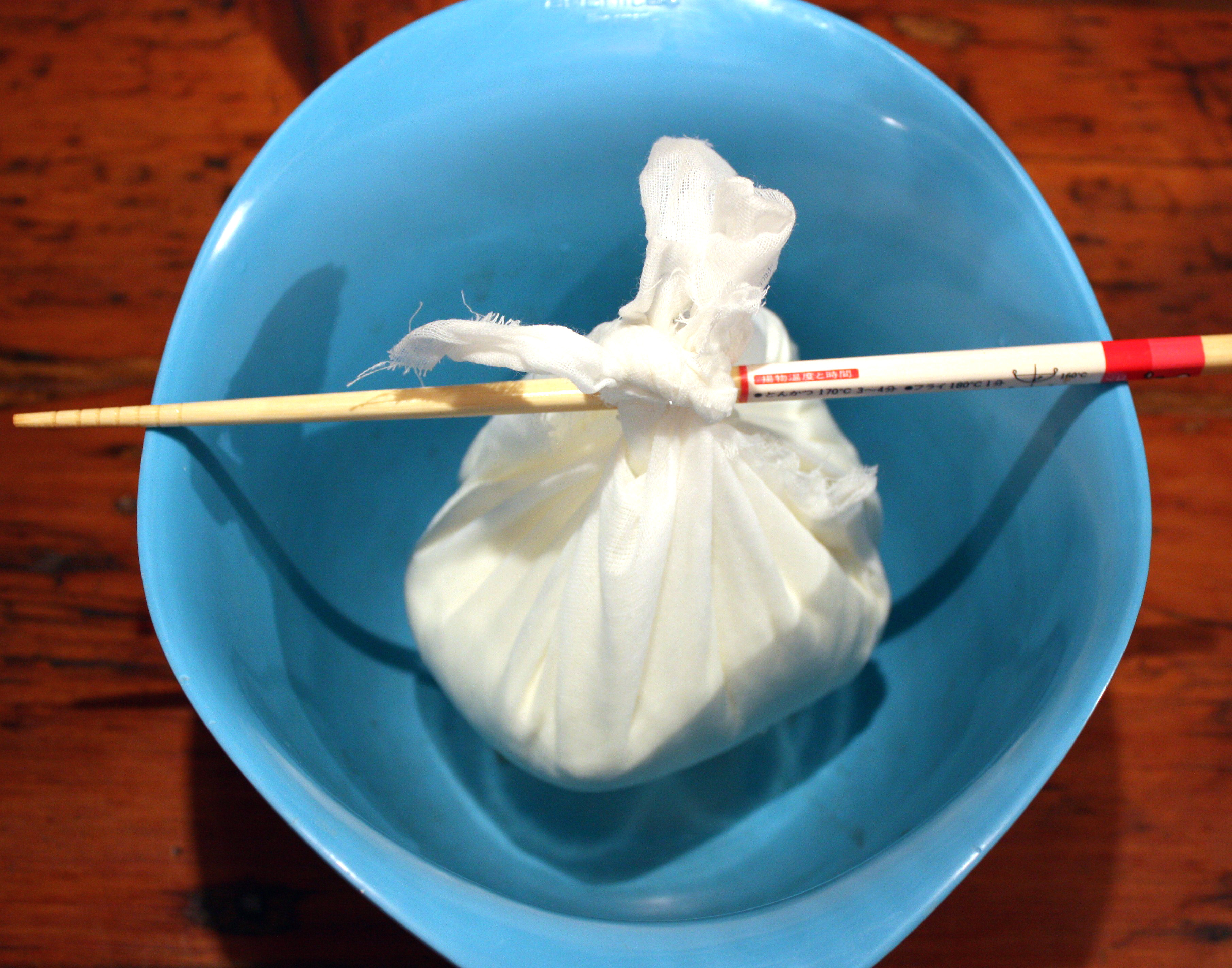 - Tie the corners of the muslin into a knot and hang the bag to drain for 30 – 60 minutes, or until the cheese has reached the desired consistency. If desired, hang over the bowl of whey to catch any last drops. The cheese is ready to eat immediately. For a creamier consistency, add the cream at the end and mix thoroughly.