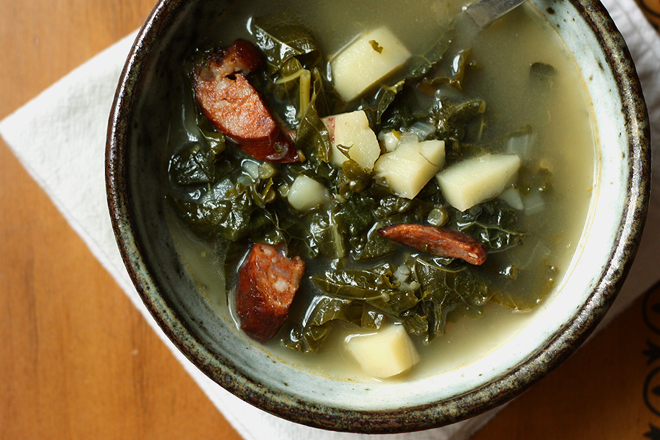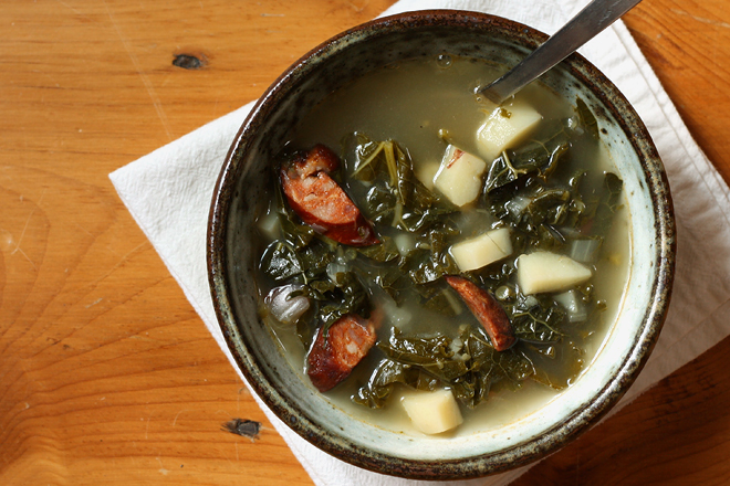 Traditionally, this soup is made with spicy, cured Portuguese sausage, linguica, which can be hard to find in the States, unless you live near a Portuguese neighborhood. Occasionally, I splurge and have some Gaspar’s linguica shipped – not exactly “artisinal,” but what I grew up with (linguica pizza Sundays were a tradition at our house), and I’ve yet to find any local source for linguica. Chorizo is an acceptable substitute; any cured, spicy sausage will likely work, but you don’t want to use too fatty a sausage, or it will overwhelm the lightness of the broth. Bom apetite!
