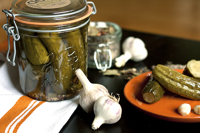I’ve made dozens of batches of these deli dills over the last four years and, after much tweaking, I’ve finally settled on a ratio of dill-to-spice-to-garlic that works for Tai, the resident pickle lover. This recipe (apparently) makes a nicely dilly, not overly salty, but quite garlicky pickle. Adjust the amounts of spice, dill and garlic to your liking, although do not lower the salt as it impacts the safety of the final, canned product, and a certain level of salinity is necessary to protect the cucumbers from spoilage during fermentation.