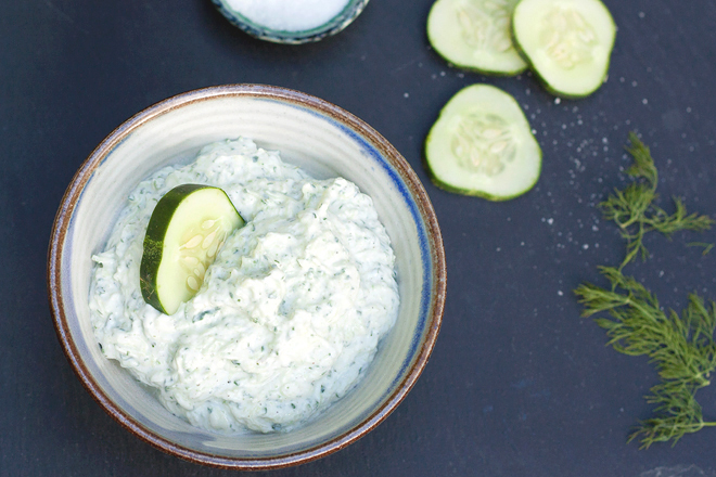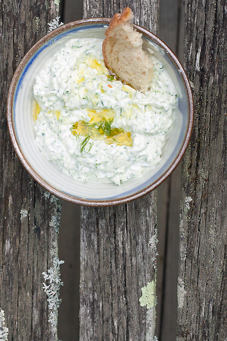 So, fast forward about a week and I thought “How hard can it be?” I’ve never made Greek food before, but I knew that a simple dish of yogurt, cucumber and dill had to be good if you started with good ingredients. I was right: it is. Simple and good. So simple that it takes about 10 minutes in total and has the added benefit of using up those small, end-of-garden cucumbers. So delicious, in fact, that we’ve been eating it with crackers, tortilla chips, on chicken kebabs, in sandwiches: luckily for me it’s quite easy to make, because I see lots more of this in our future.