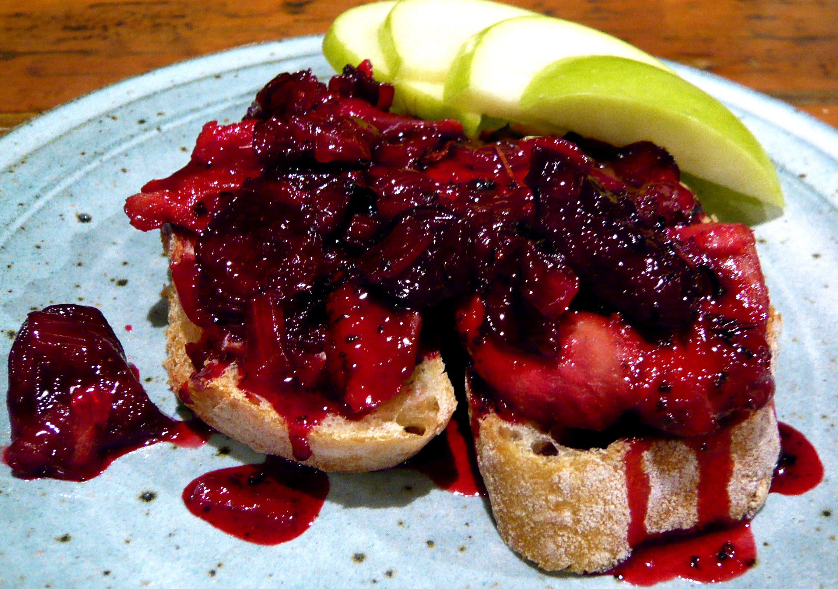 5. Arrange a cutlet over two slices of baguette.  Spoon onion-beet sauce over the cutlet, letting some of the syrup soak into the bread.  Garnish with fresh green apple slices and serve hot.
