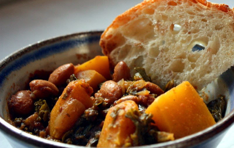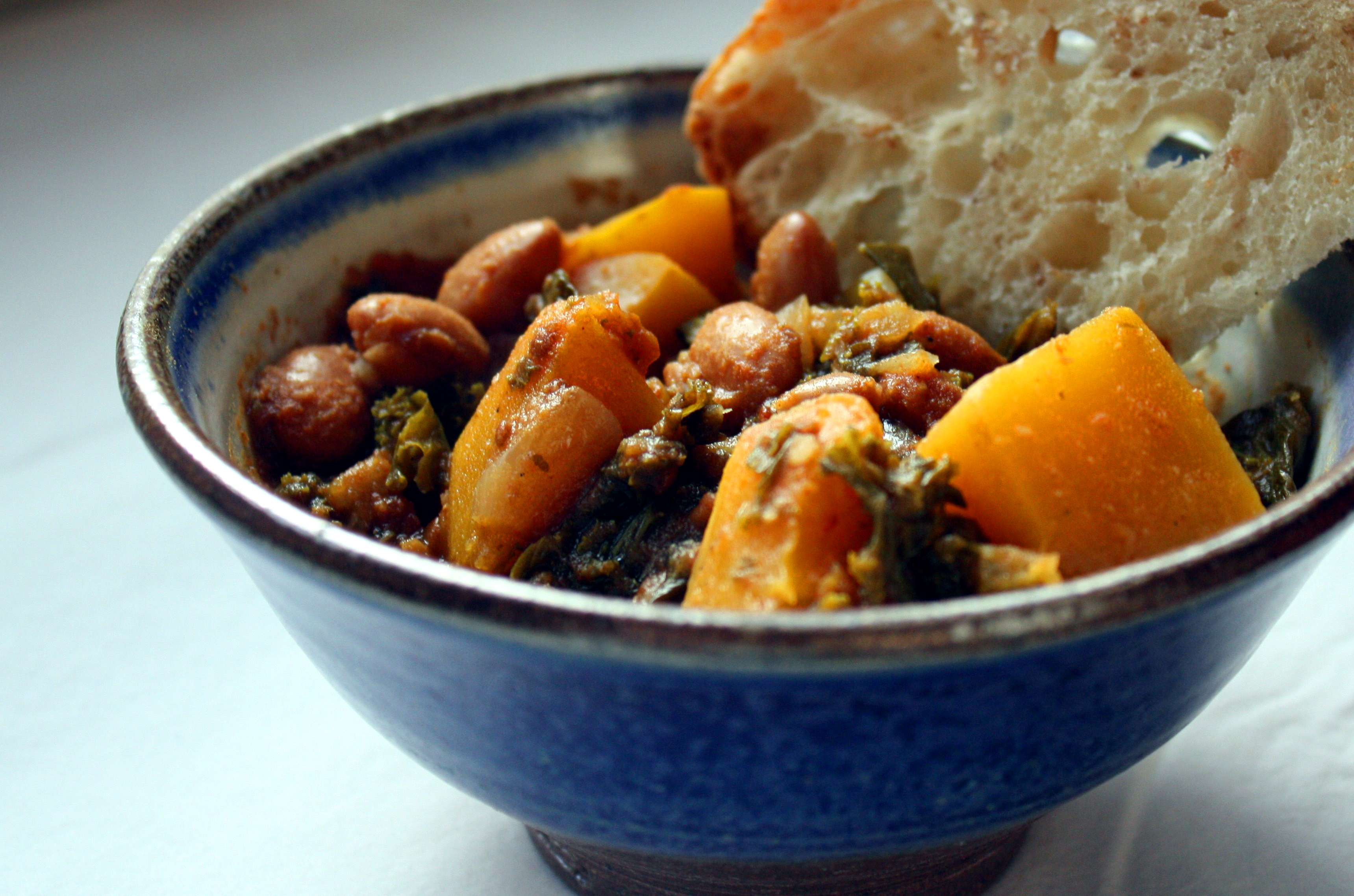 I’ve long been of the belief that, if you add enough curry to something, it’s bound to be good. This stew upholds the belief: nothing spectacular, just good, tasty, warm and comforting stew for a snowy New York Sunday. The bonus is that this was a freezer-clearing special: I used some cooked cranberry beans that were hanging out in the fridge, frozen pumpkin cubes leftover from this soup, frozen kale put-up this summer, plum tomatoes that I stuck in the freezer, whole, just before we left on our honeymoon, tomato paste that I put up last summer and turkey stock made from a few of these dinners.