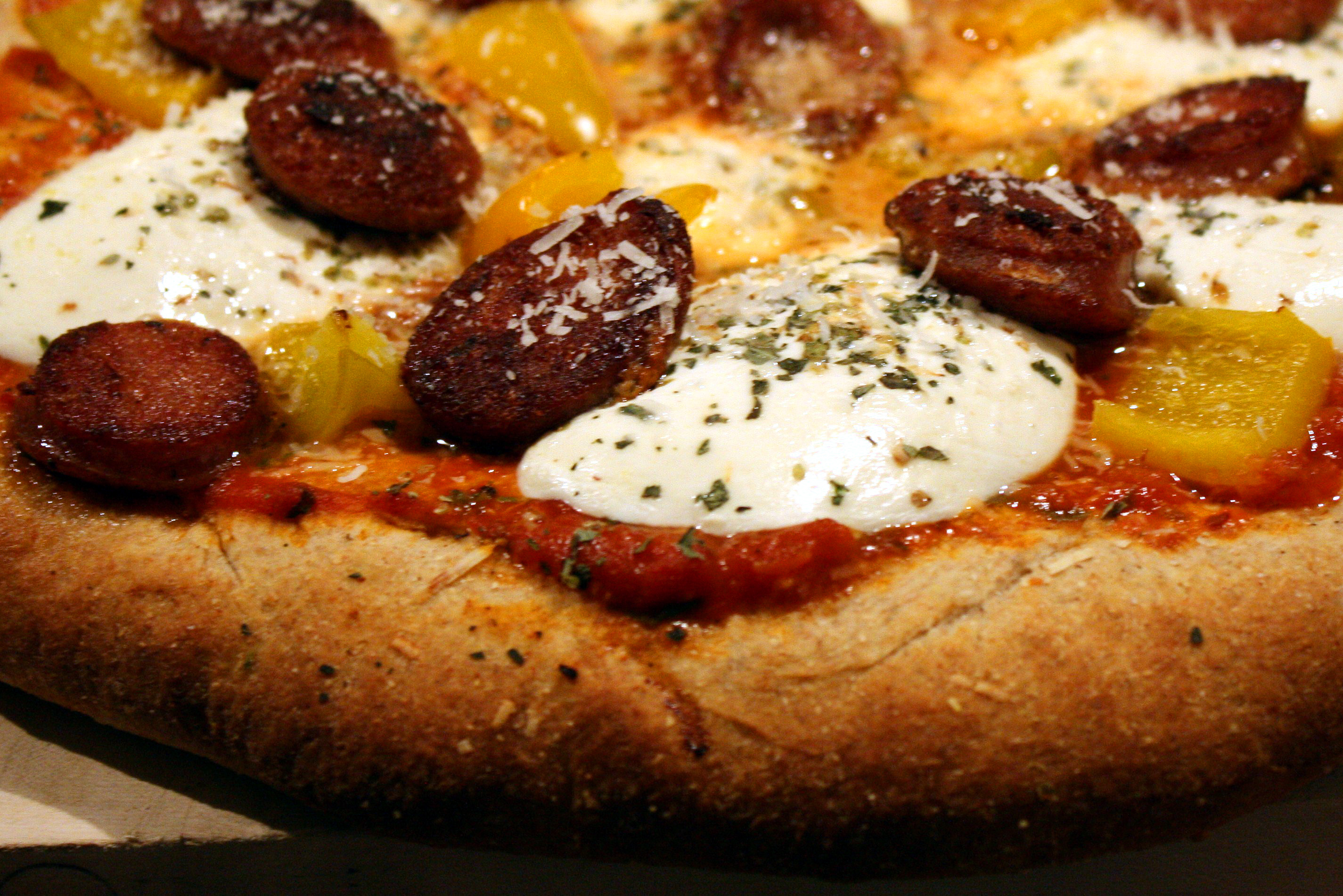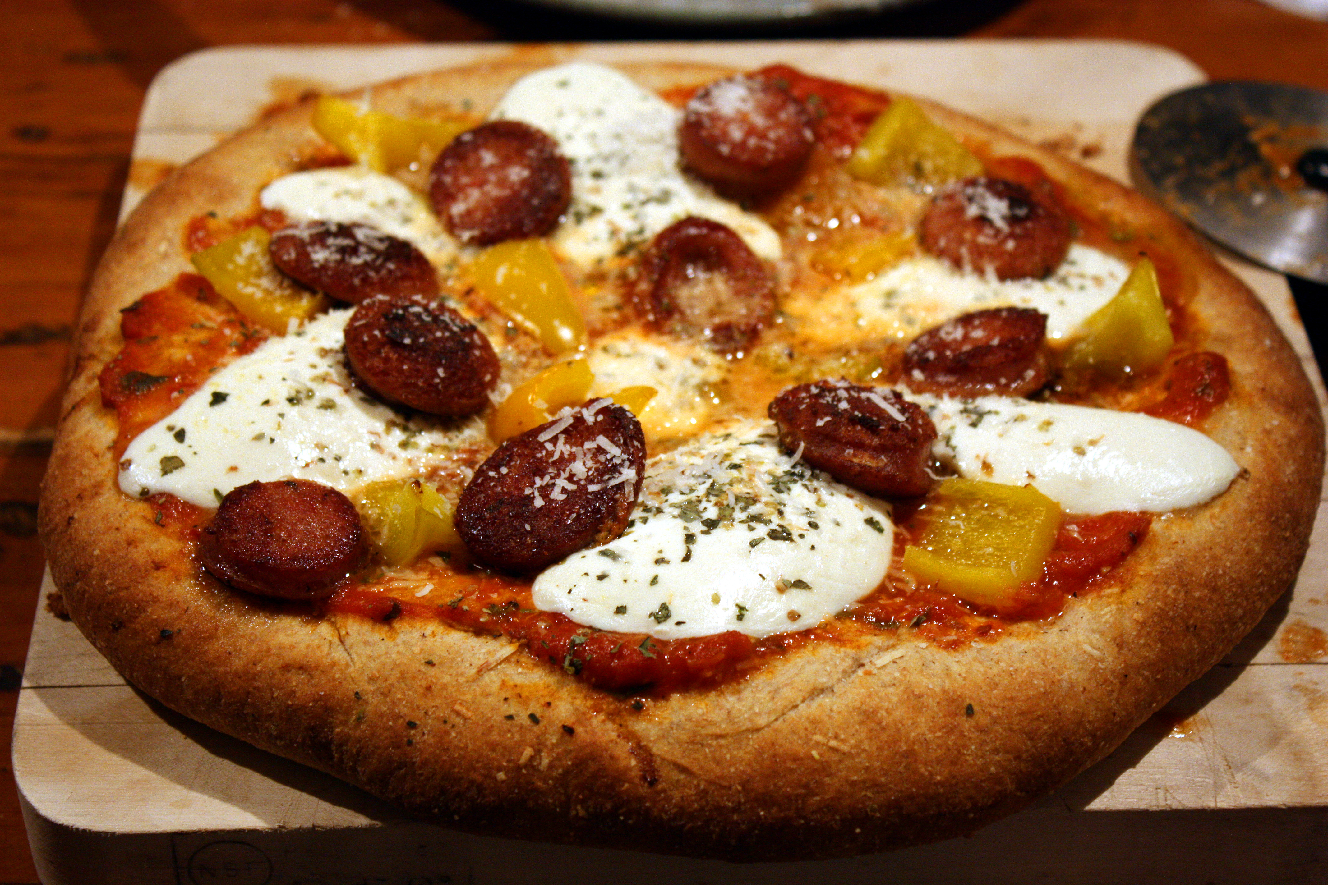 1. The frozen peppers were not completely thawed when I added them to the pizza; they added a bit too much water to the pizza after cooking. Next time I will thaw completely and dry saute them for a minute or two in order to leech out some of the water prior to cooking the pizza.