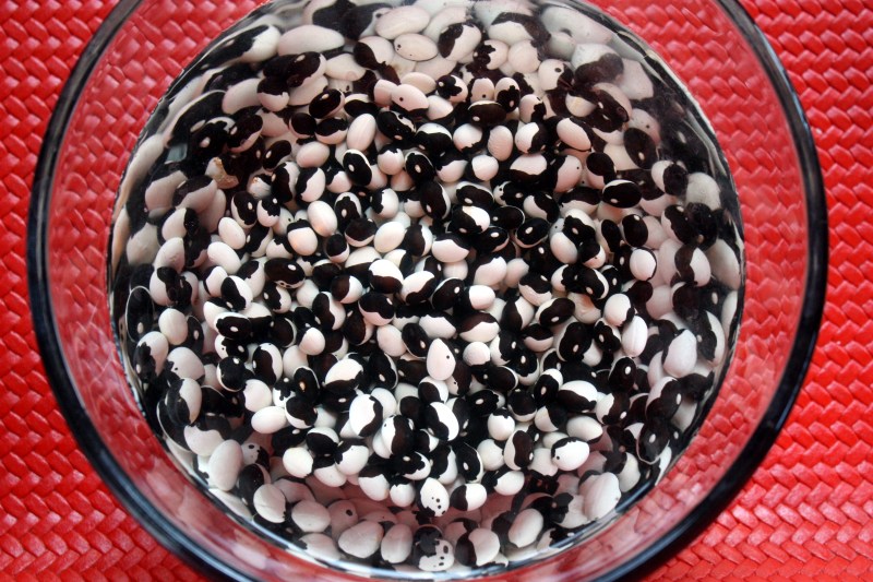 1. Soak and cook the beans. I soaked the beans for about 6 hours, then simmered over low heat, in the soaking water, with ¼ of the onion and 2 smashed garlic cloves, for about 1 and ½ hours.  Add 1 tsp of salt about halfway through the cooking time.  When the beans are tender but still a bit al dente, turn off the heat and allow them to sit in the bean broth.