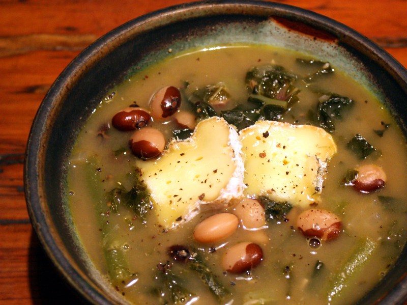 1. The original recipe called for borlotti beans, a cranberry variety that would work nicely here.  The original also called for fresh cabbage in place of kale and a garnish of arugula pesto.  I think mint pesto would work well with this dish, but we both loved the flavor and creaminess of the melted Cowgirl Creamery Pierce Pt cheese.