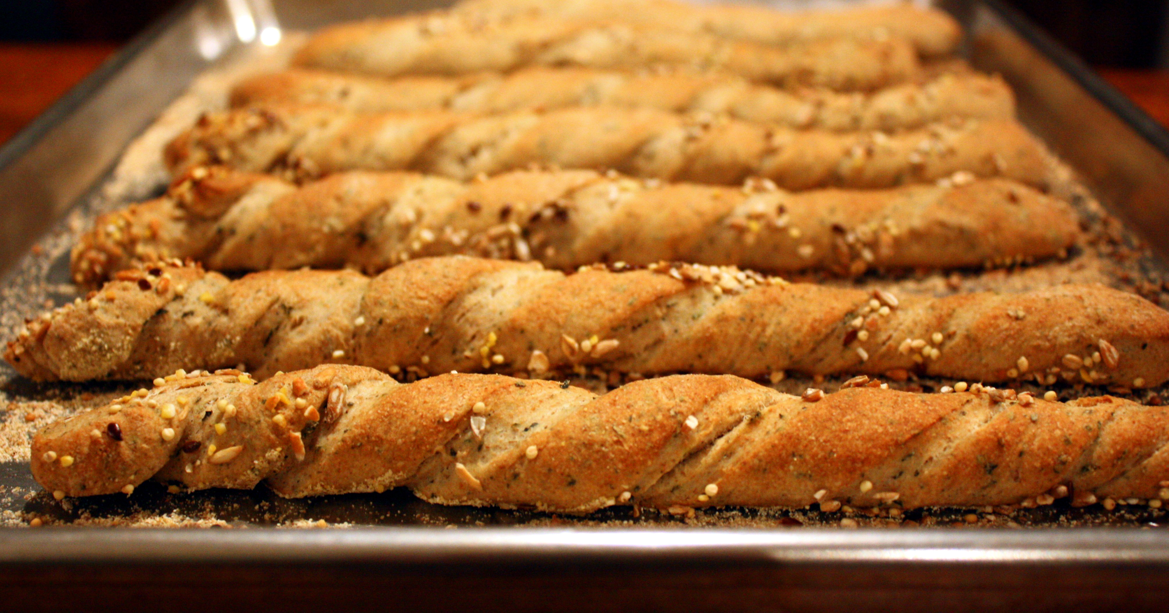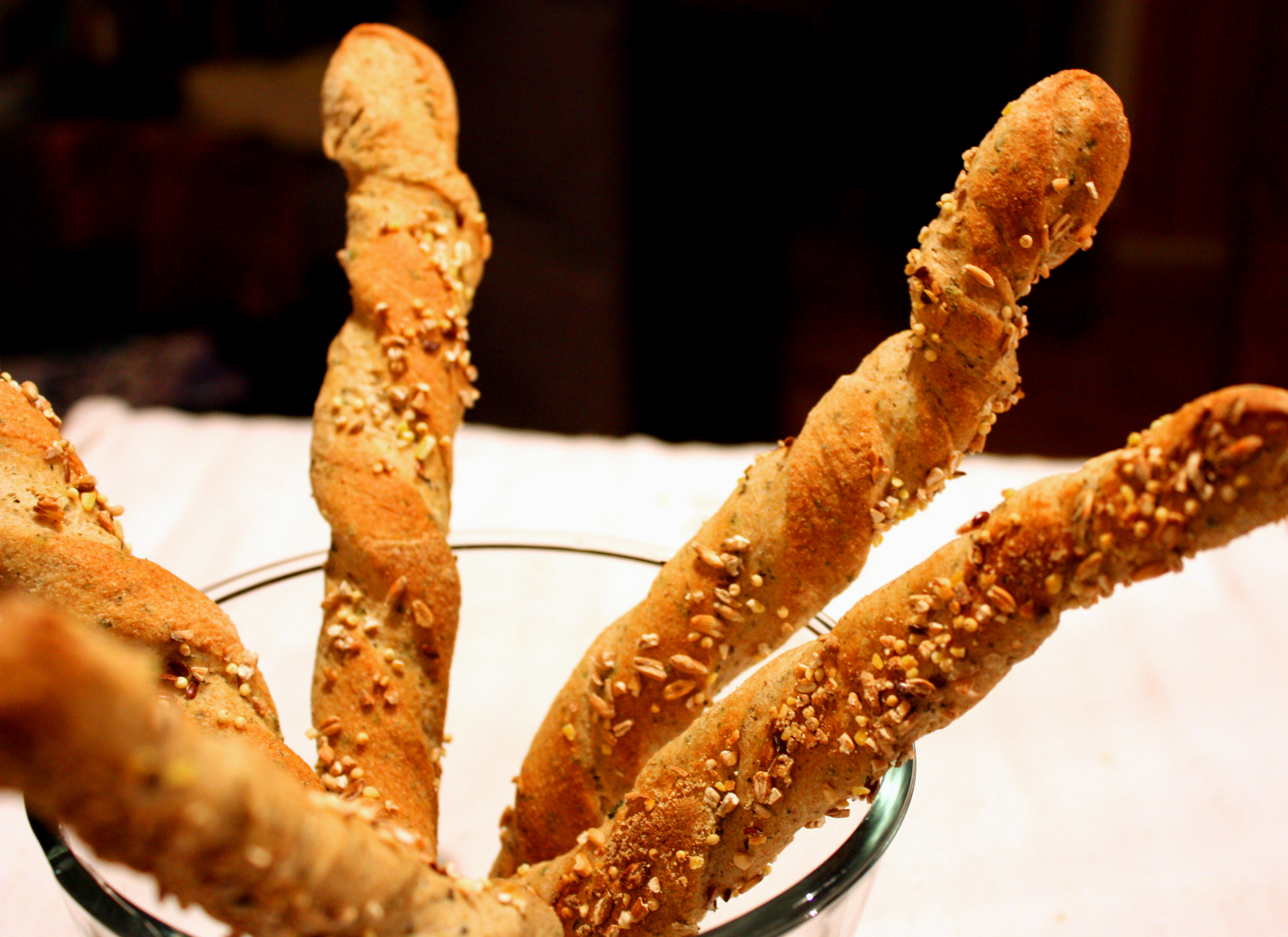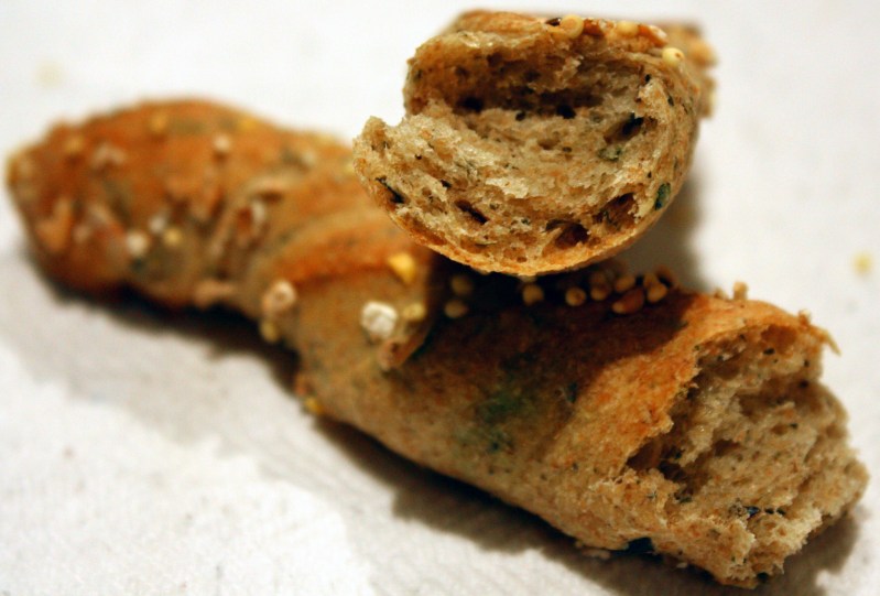 A local bread dough made with clarified butter, dried garden herbs and Wild Hive whole wheat flour makes a lovely bread. Cut into strips, given it a twist and a dip in 10-grain mix for some crunch, and 10 minutes later you have a delicious, crusty-on-the-outside, soft-on-the-inside breadstick, perfect for your Dark Days meal o’ the week.