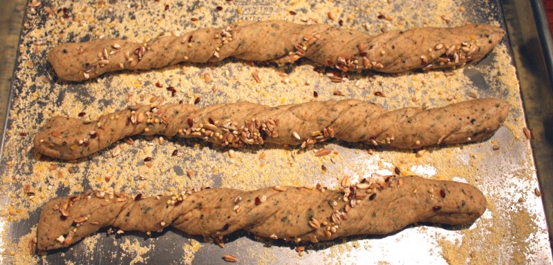 (If you like, brush the tops of the strips with butter or oil, in order to aid in browning the crust and to help any toppings stick). Pick up the ends of the dough strip, one in each hand, and twist (right hand clockwise, left hand counter-clockwise) several times until the length of the strip is twisted. Dip in cornmeal, 10-grain mix, sesame or flax seeds, or grated cheese, for decoration and flavor. Place on a baking sheet liberally sprinkled with cornmeal and/or 10-grain mix (or lined with parchment). Cover loosely with plastic wrap and allow to rest (and rise slightly) for 10 minutes.