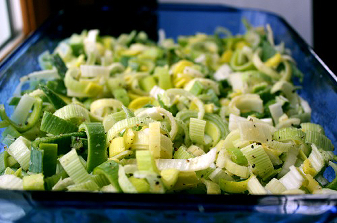 2. Arrange sliced leeks in a 9″ x 13″ shallow baking pan. Drizzle melted butter over leeks, add salt and pepper, and toss to evenly coat.