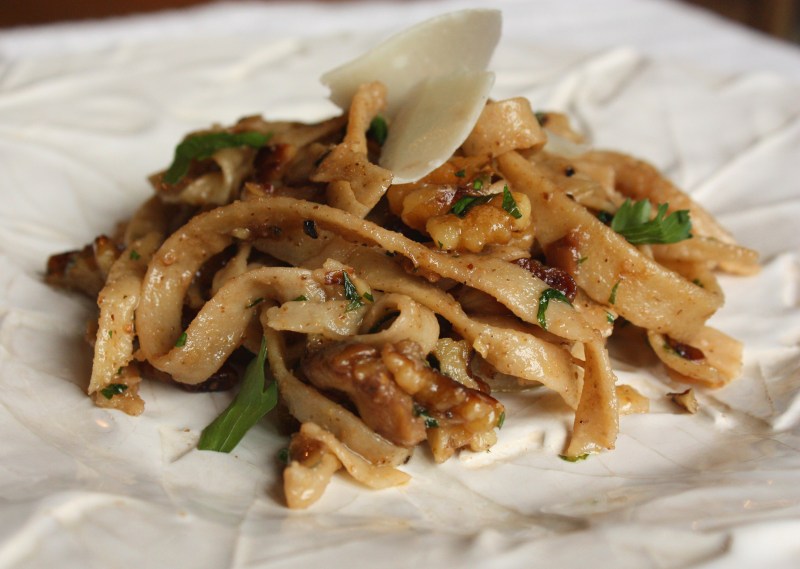 The flavor of this earthy peasant pasta dish is belied by the simplicity of its preparation: it is rich yet sutble, with a layering of fruity olive oil, sweet roasted garlic and just slightly bitter toasted walnuts, all blending to create a taste that is more than the sum of its parts. Homemade pasta and slow-roasted garlic make this a pleasant (and aromatic) lazy Sunday project; but if you have roasted garlic on hand, leftover, perhaps, from another recipe, and some good storebought pasta, this satisfying meal can be whipped up in minutes.