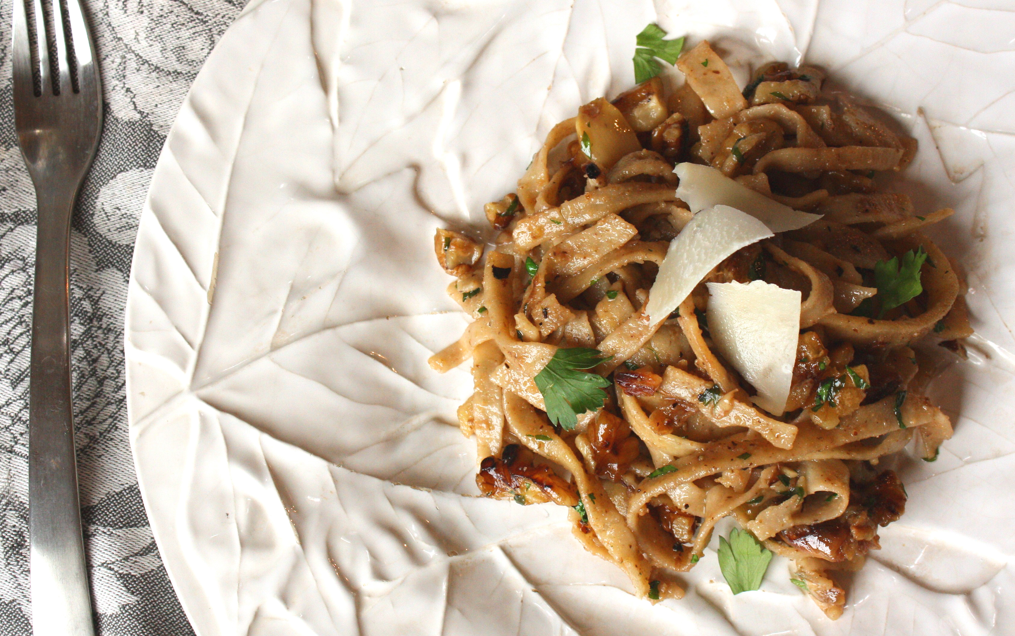 - Make the sauce. Pull the roasted garlic cloves out from their skins (I like a fork for this). In a small bowl, mash about 6 of the cloves with a fork, to form about 4 – 5 tbsp of garlic purée. Heat 1/4 cup of olive oil (including any remaining roasted garlic oil) in a small skillet over medium-low heat. Add ground walnuts and garlic purée and sauté over low heat for about 5 minutes, stirring frequently. Add more olive oil as necessary to keep sauce from sticking. Add remaining garlic cloves, toasted walnuts, chopped parsley and salt and pepper to taste. Heat through for 1 to 2 minutes. Taste, adjust seasonings, and toss sauce with pasta, either in the pasta pot or in a large bowl for serving. Top with additional chopped parsley and shaved Parmesan. Serve immediately.