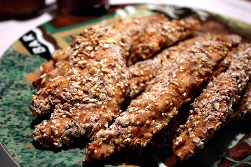Make no mistake: this isn’t fried chicken. I’m always suspicious of those recipes for baked chicken strips that claim to taste “just like KFC.” For one thing – ew. For another thing, they seem to miss the essential point: fried chicken isn’t just about crunch, it is also about very moist and tender meat, the kind, in my opinion, that you only get when you can cook that meat very quickly at very high temperatures (like, for instance, when you drop it into boiling oil). So, if you want fried chicken, my advice is, fire up the fry-o-later and have at it. But if you want some crunchy chicken fingers that are healthy, flavorful and 100% local? Give these a try.