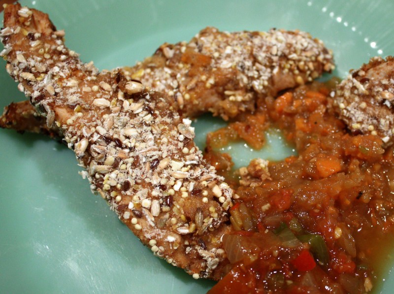 This was a very haphazard recipe; I had been planning on making spicy chicken strips, chicken breast fingers essentially braised in a hot sauce until cooked through. They are quite delicious and handy to have on hand for sandwiches, salads and snacking. Yet I felt the need for something crunchy. So I changed plans, and took the marinating chicken strips, dredged them in a flour/multi-grain mix and baked them spread on a baking sheet instead of puddled in their spicy sauce. The result was – good. Crunchy, different, a satisfying dinner served with spicy red salsa and chutney. I would do some tweaking next time (longer marinade, cornmeal instead of flour, more spice) but I think the recipe could become a standby.