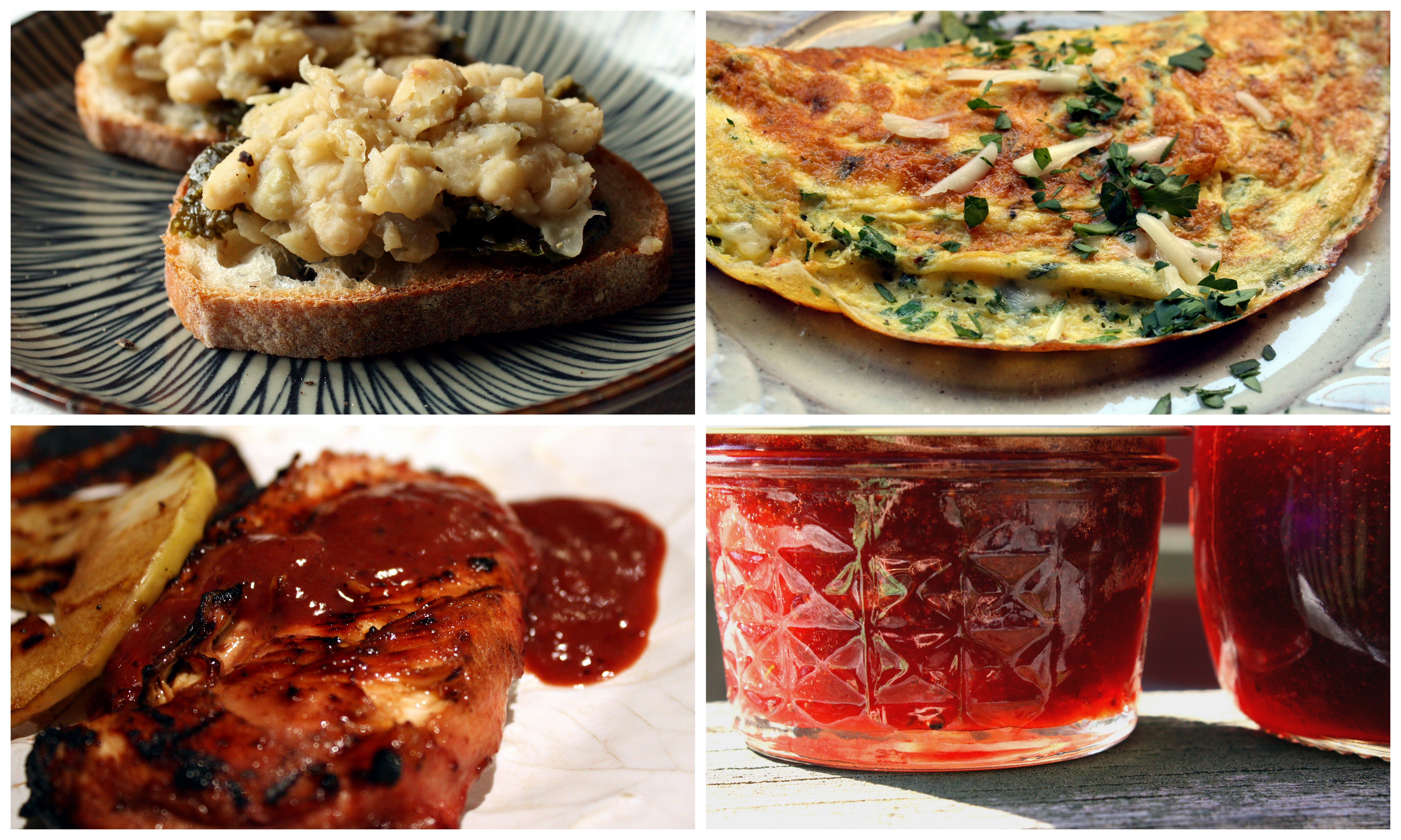 There was plenty of local eating going on: I made us 100% local omelets (Kaela, not French, style) with eggs from Holbrook Farm, local farmer’s market cheese, and fresh parsley from Madura Farms in Goshen, NY. We celebrated the fine weather by firing up the grill and grilling Empire Kosher chicken breasts with homemade strawberry balsamic jam that I put up last summer, served with grilled sliced Fishkill Farms apples. I re-heated this fabulous white bean bruschetta, made with the last of the summer’s frozen kale and Rancho Gordo flageolet beans hand-carried to me by my San Francisco-living friend Christina, and served on top of Wave Hill crostini. Finally I made a strawberry, rhubarb and caramelized onion jam with frozen Jones Family Farms strawberries, frozen rhubarb from Tai’s aunt’s garden in Maine, and Cippolini onions from Madura Farms.