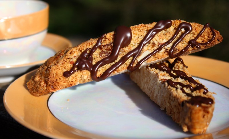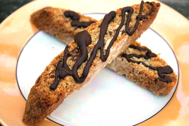 - If desired, melt chocolate in a double-boiler or microwave; drizzle melted chocolate over biscotti with a fork, or dip one end of each cookie into a small bowl of melted chocolate. I added about 3 drops of orange oil to the melted chocolate: delicious!