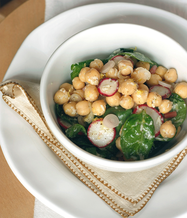 - In a large bowl combine chickpeas, spinach, ramps and radishes. Toss to mix.