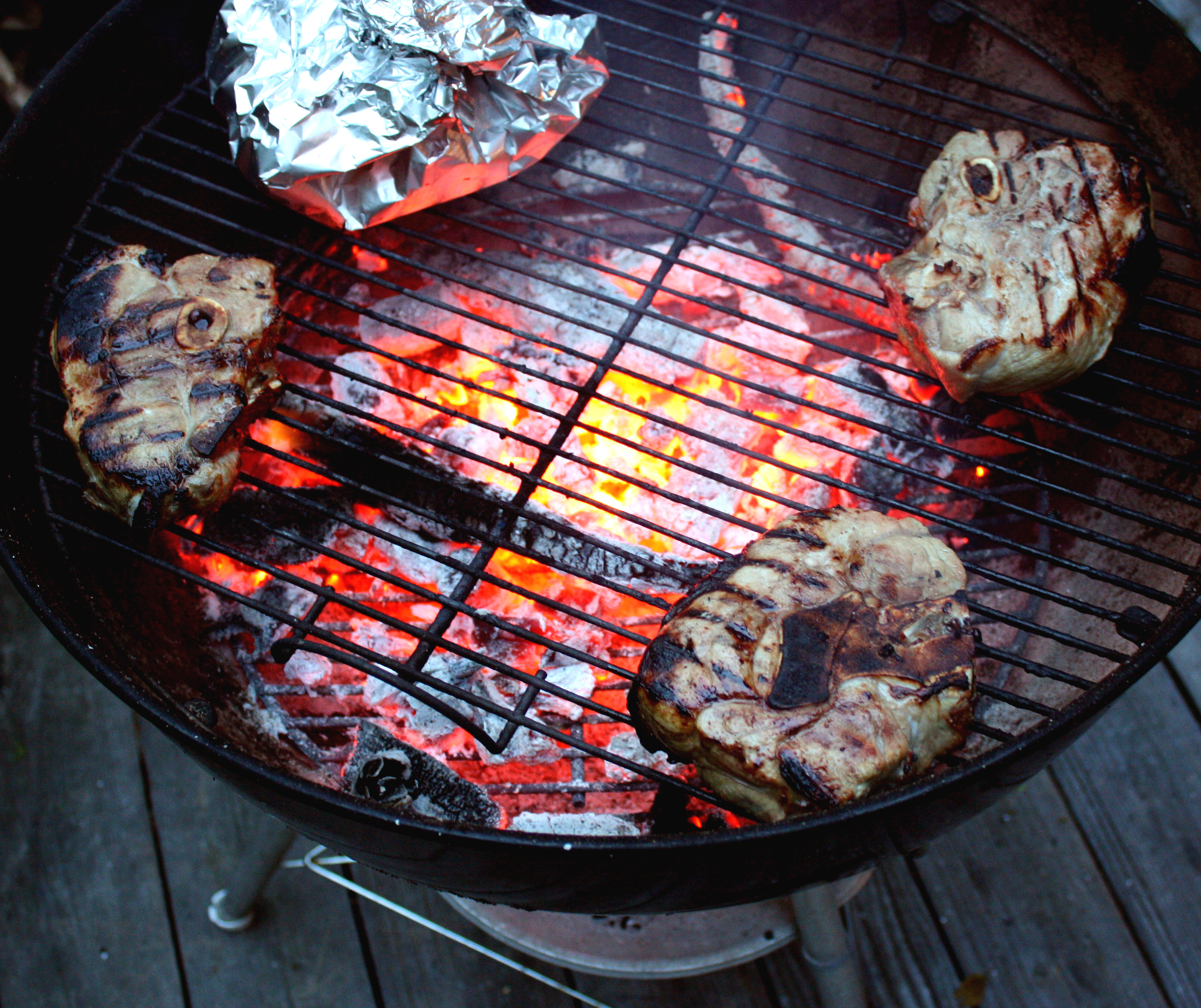- Light grill. Since my pork chops were very thick, I piled a charcoal/wood fire high in the center of the grill, for a nice, long-lasting bed of coals, but left the outside edges clear, for a low-heat option to slow cook the thick chops. If your chops are thinner (less than 1 inch) you should be fine cooking them directly over flame. If you use a propane grill, for thick chops set the flame to low, or sear initially over a high flame then turn down to low.