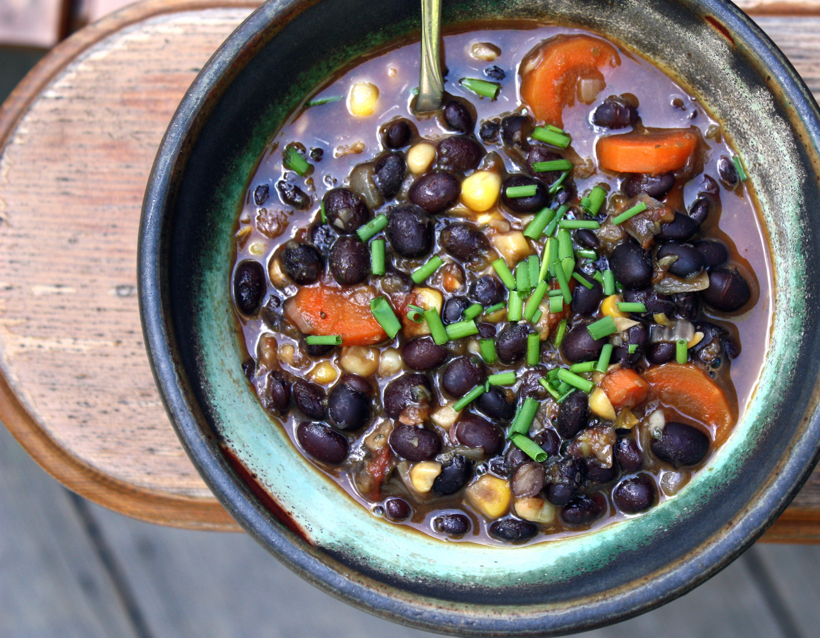 I love meals like this: it makes me so happy to pull ingredients out of the freezer or pantry that I made myself, or carefully preserved during the height of last year’s harvest, and whip up a tasty and satisfying dish. In this soup, the onion, garlic and carrot were all from Madura Farms, and picked up at my weekly farmer’s market; the summer squash was grated and packed into small Ziplocs, in 1/2-lb portions, by me last summer; the corn was grilled by Tai, then cut off the ear and flash-frozen; the habaneros were gifted to me from a friend’s organic CSA, and have been flavoring my meals all winter long. The salsa was homemade from some of the precious few tomatoes of last year’s blighted crop; the tomato paste also homemade, from the abundant ’08 season; the stock a homemade chicken/turkey mix and the chives were a volunteer surprise in a garden container that did not get emptied before winter. The beans were from Cayuga Pure Organics (I finally managed to pick some of these local beans up from the Wild Hive Cafe) that I had cooked the other day to make veggie burgers. All in all, this soup came together in about 15 minutes, in the midst of a kitchen belabored by some serious Spring cleaning: it was a simple, one-pot dish, and perfectly delicious for lunch while taking a well-earned break on the back deck.