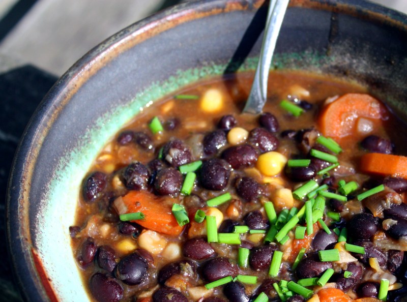 Filling yet light, hearty yet summery, this soup is a study in contrasts. Most black bean soups make me think of winter or fall; thick, hearty soups flavored with ham hock or bacon, and blended unti they are almost a dip you can eat with tortilla chips. This black bean soup, in contrast, is light and summery, despite the fact that summer vegetables are still a couple of months away.