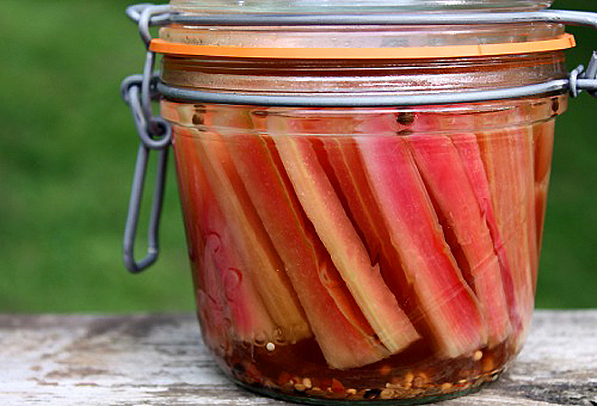 - Stack chard stems into hot, sterilzed jars and cover with brine, leaving 1/2-inch headspace. Wipe rim, affix lid and process in a boiling water bath for 10 minutes (alternatively, you can store these pickles in the fridge for about 1 month).