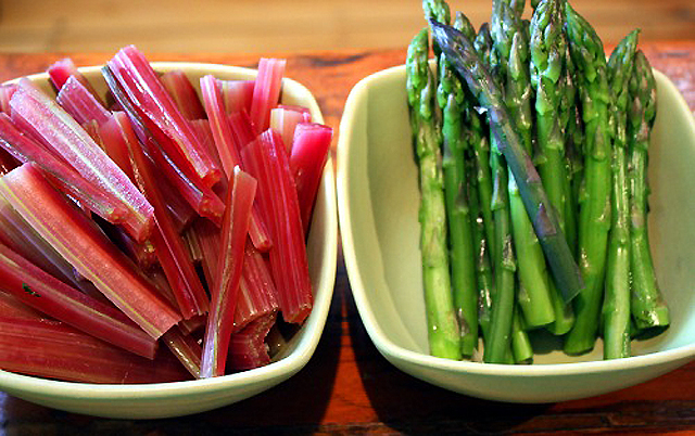 The kale was blanched, shocked and frozen: perfect timing as we just used up the last bag of frozen kale on Thursday night. Four pounds of Kirby cucumbers were scrubbed, trimmed and submerged in brine in the big, red pickling bowl to ferment: Tai will be thrilled to have some of my Garlicky Dill Pickles again. Asparagus was blanched, shocked & trimmed: the tip halves were pickled while the stem halves were sliced & frozen. The bright pink stems of the monster rainbow chard I brought home were far too gorgeous to discard, hence I Googled around for pickled chard recipes and found this one, from the Gramercy Tavern, published only a couple of weeks ago in the NY Times.