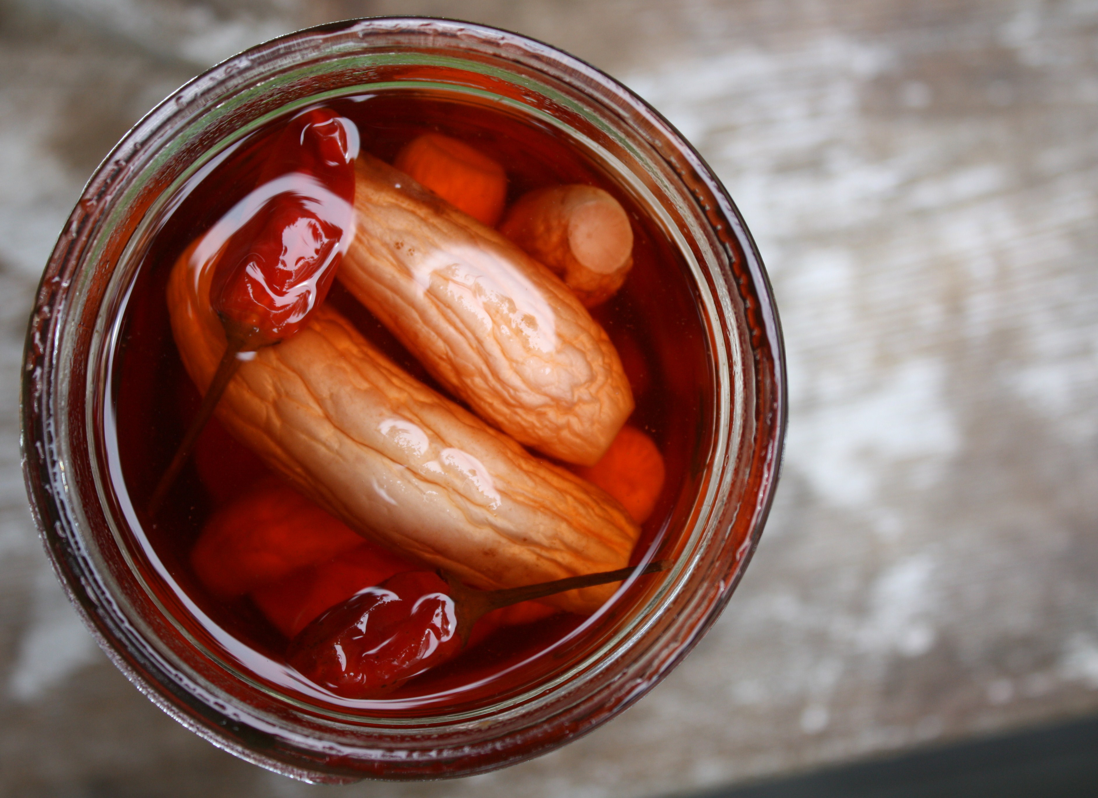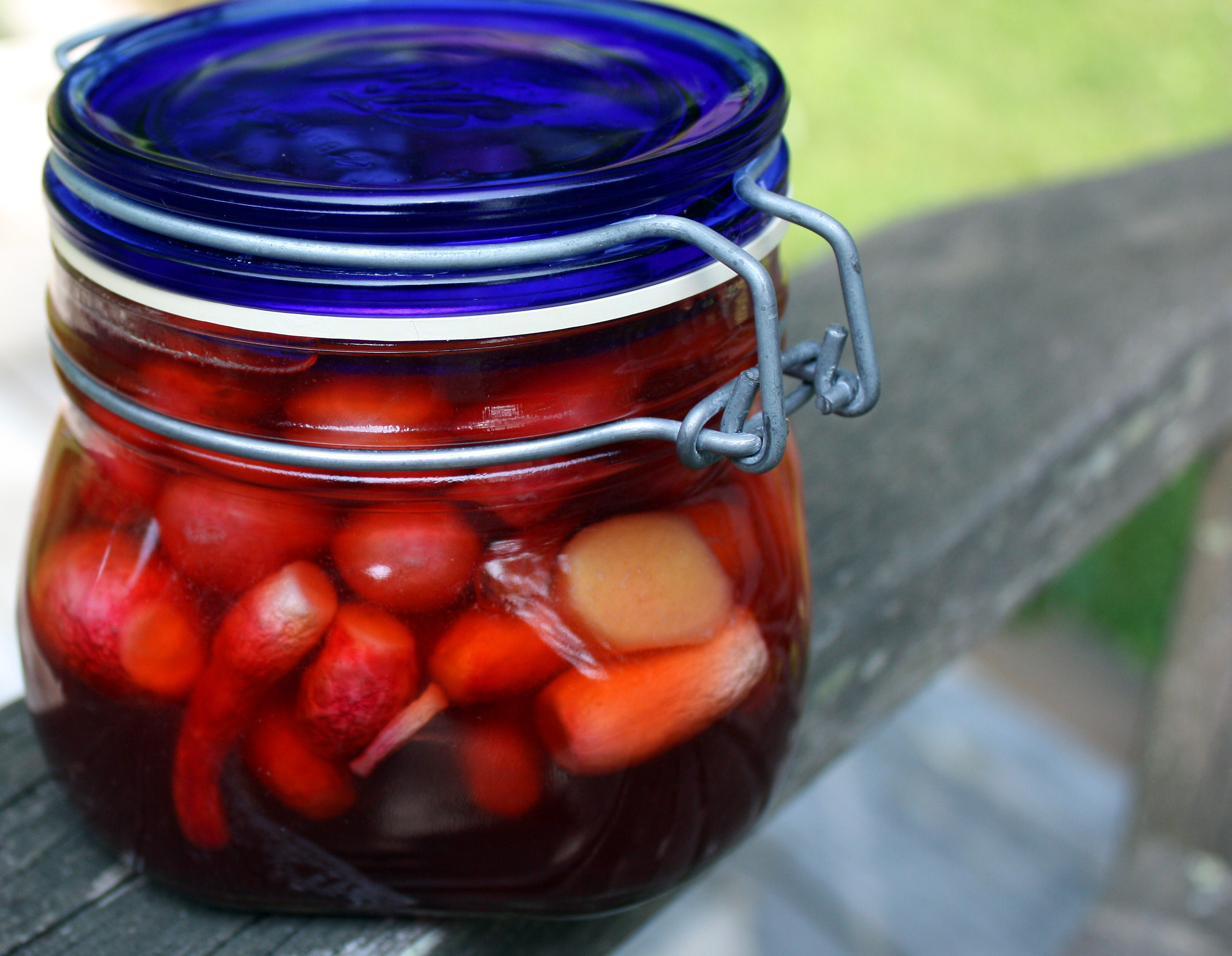 I put these little beauties up right before I left for South Africa, since I knew that two big bunches of radishes would do nothing but wither and die in the crisper if they had to rely on my Darling Hubs to eat them. They have been pickling away, down in the relative coolness of the garage, for over a month now, so I figured it was about time for a taste test.