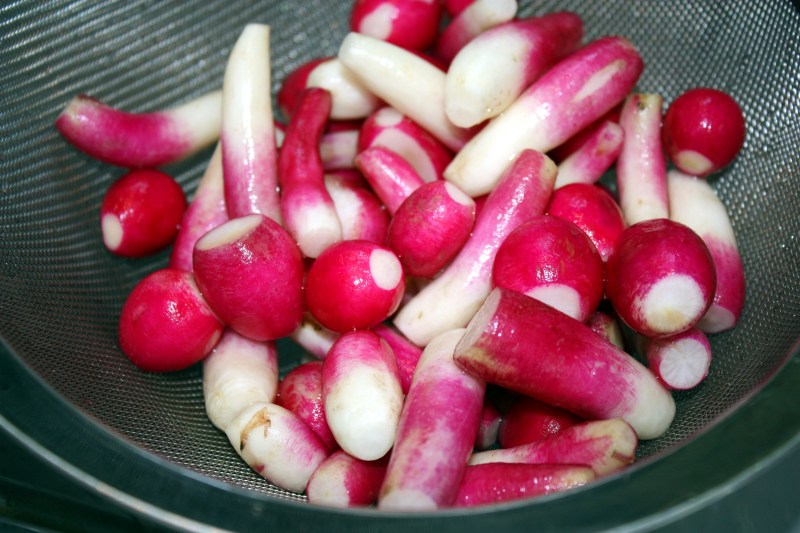 • 2 large bunches of baby radishes (or regular radishes halved or quartered), well-scrubbed and root and stem ends trimmed