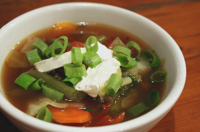 - Add stock, cabbage, green beans, tomatoes, herbs and spices. Cover and bring to a simmer over high heat. Reduce heat and simmer, partially covered, until flavors blend and vegetables are tender, about 15 minutes. Taste, adjust herbs and/or spices, and serve hot, garnished with green scallions and goat cheese.