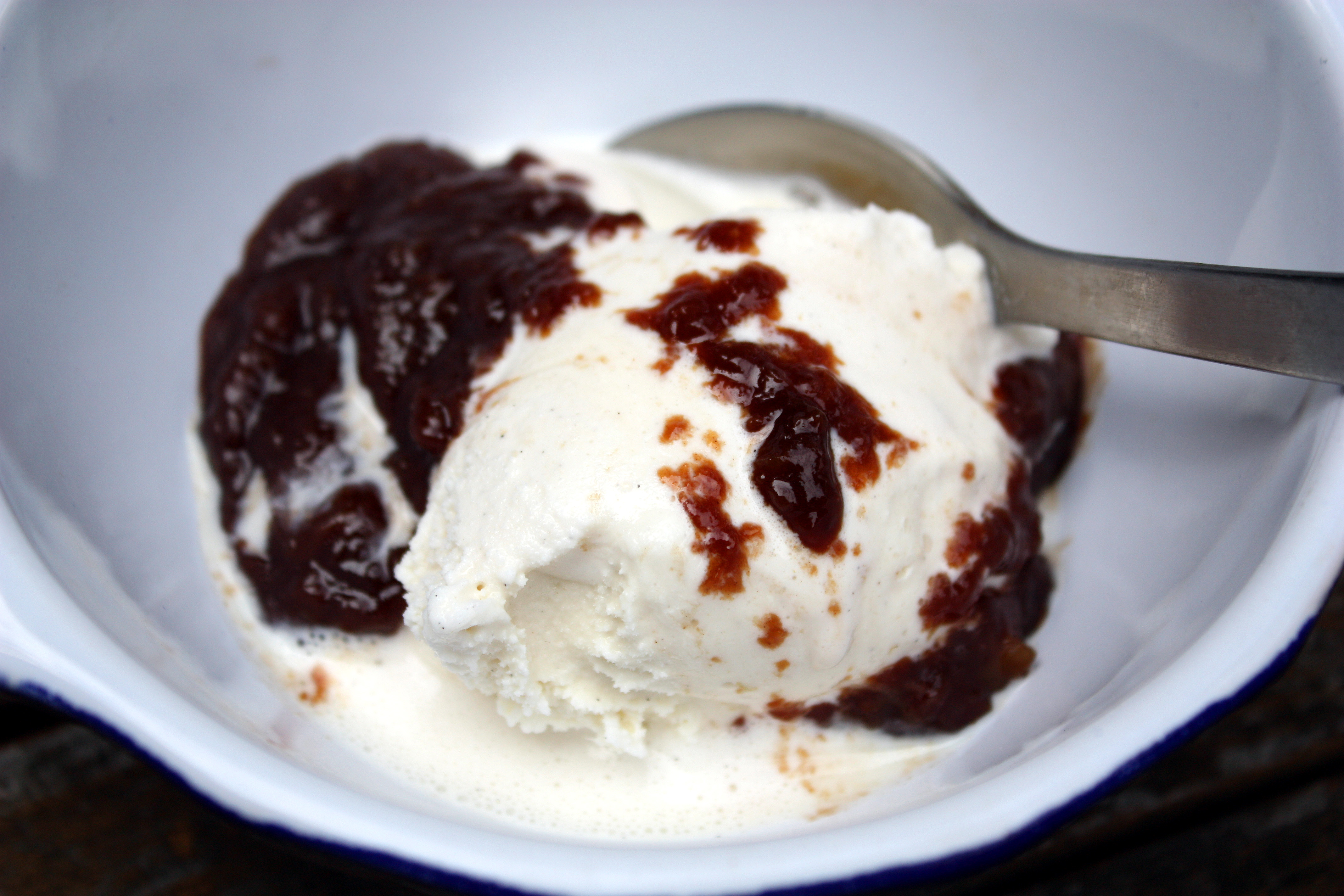 As for this recipe?  Surprisingly delicious given that I was just wily-nily throwing peaches into various bowls and adding sugar; some lemon juice to one, some booze to another, a little salt, a few chilé peppers.  The texture of this is lovely, small chunks of peach suspended in a creamy, just-barely-pourable sauce; the flavor is full of fresh peach, with the chocolate as almost an undernote, and not overly sweet.  It went so well with Talenti’s Tahitian Vanilla Bean gelato that I think I would add some vanilla extract next time; also I would be interested in testing out some espresso powder to punch up the chocolate flavor a bit.  Usually Tai is the “anything-sweet-over-ice-cream” guy in this house, but even I did a little yummy-noise-moan when I tasted this one (and yes, I did taste test it over ice cream at 10:30 am this morning. I do it all for you, people; all for you.).