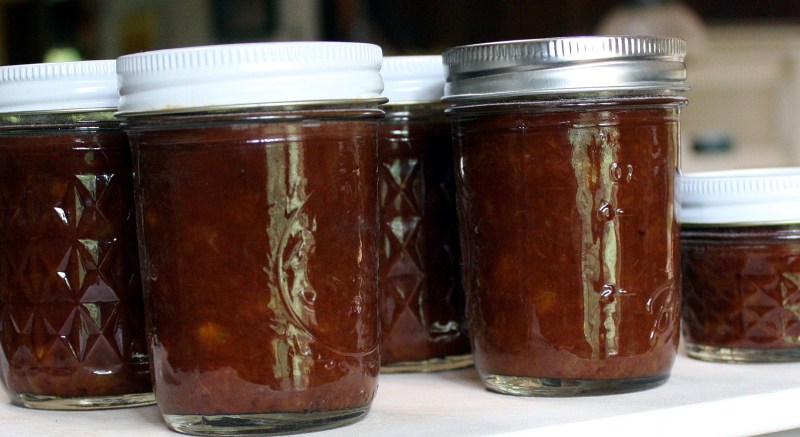 4. As always, I don’t like my fruit preserves overwhelmed with sugar; this sauce is sweeter than many of my preserves, but still calls for far less sugar than the Ball recipes (which would add about 8 cups of sugar to this amount of fruit). You can safely add any amount of additional sugar to the recipe to suit your taste.