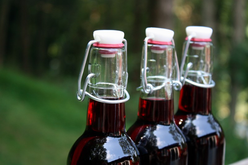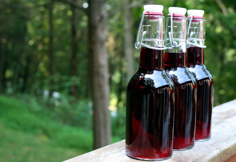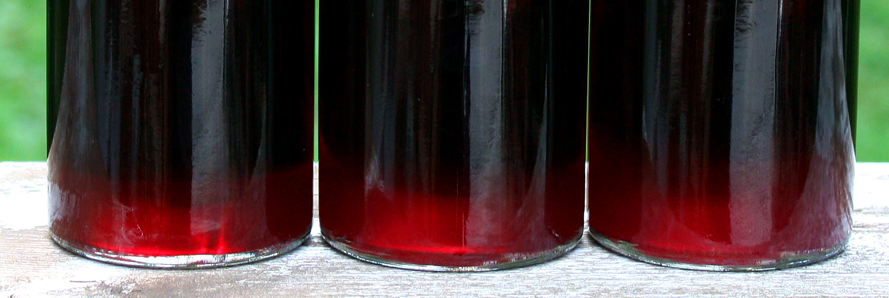 Sadly, this is the kind of photography assignment that always defeats me: how to impart to you just how beautiful these sparkling bottles of berry-infused goodness are, without over-exposing them in the harsh sunlight, capturing (cool, but ultimately distracting) reflections of the cottage or Your Intrepid Photographer in the bottles, or accurately depicting the complex color within the vagaries of my two-button knowledge of Photoshop. Ah, well; you’ll just have to take my word for it: it’s gorgeous, it’s easy and it doesn’t require turning on the stove. A win-win-win!  Happy weekend, everyone.