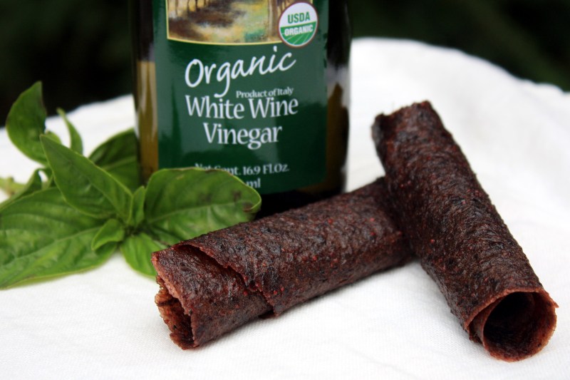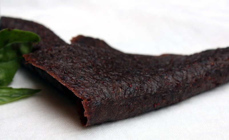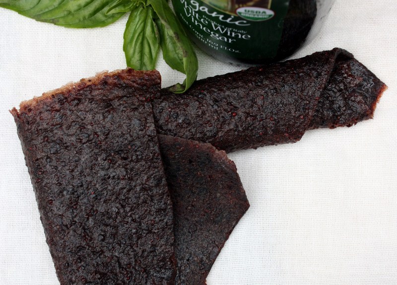 Being congenitally incapable of throwing anything out, I clearly was not going to just discard perfectly good blueberries and basil simply because they had been sitting in vinegar in my garage for a month. But let’s use the term “recipe” in the loosest way possible, folks: basically, once the vinegar had fully drained from the blueberry pulp, I tossed the pulp into the food processor and starting adding things (a bit of sugar, a pinch of salt, a dollop of honey, some OJ concentrate) until it tasted good. Processed until very smooth, spread into trays in the dehydrator and the next day: blue leather. It was pure experiment; I really had no idea if it would be edible, let alone enjoyable. I figured if not, I was only wasting a few tablespoons of sugar, and, well sometimes in the name of science curiosity good food, you need to push the boundaries a little.