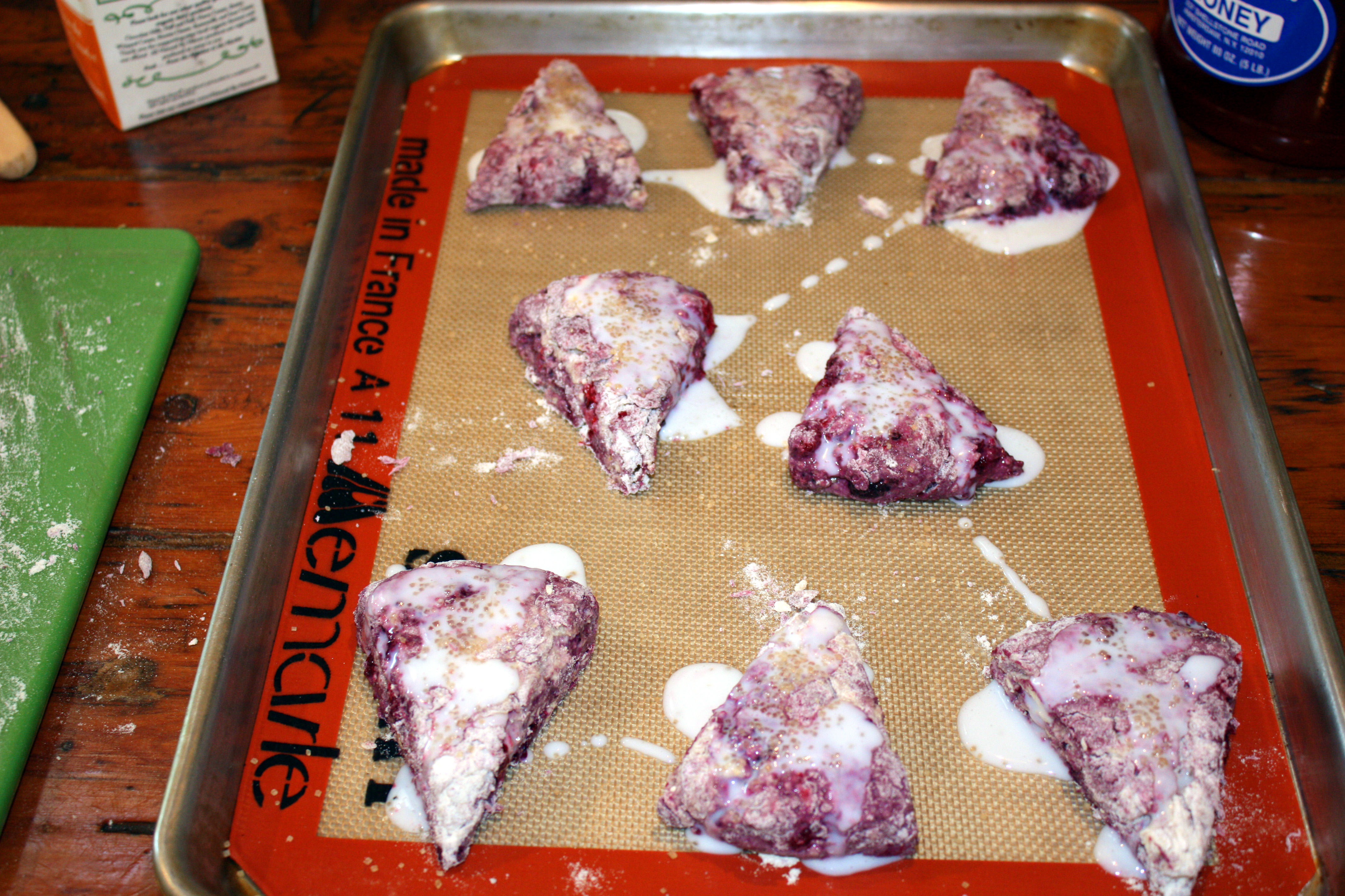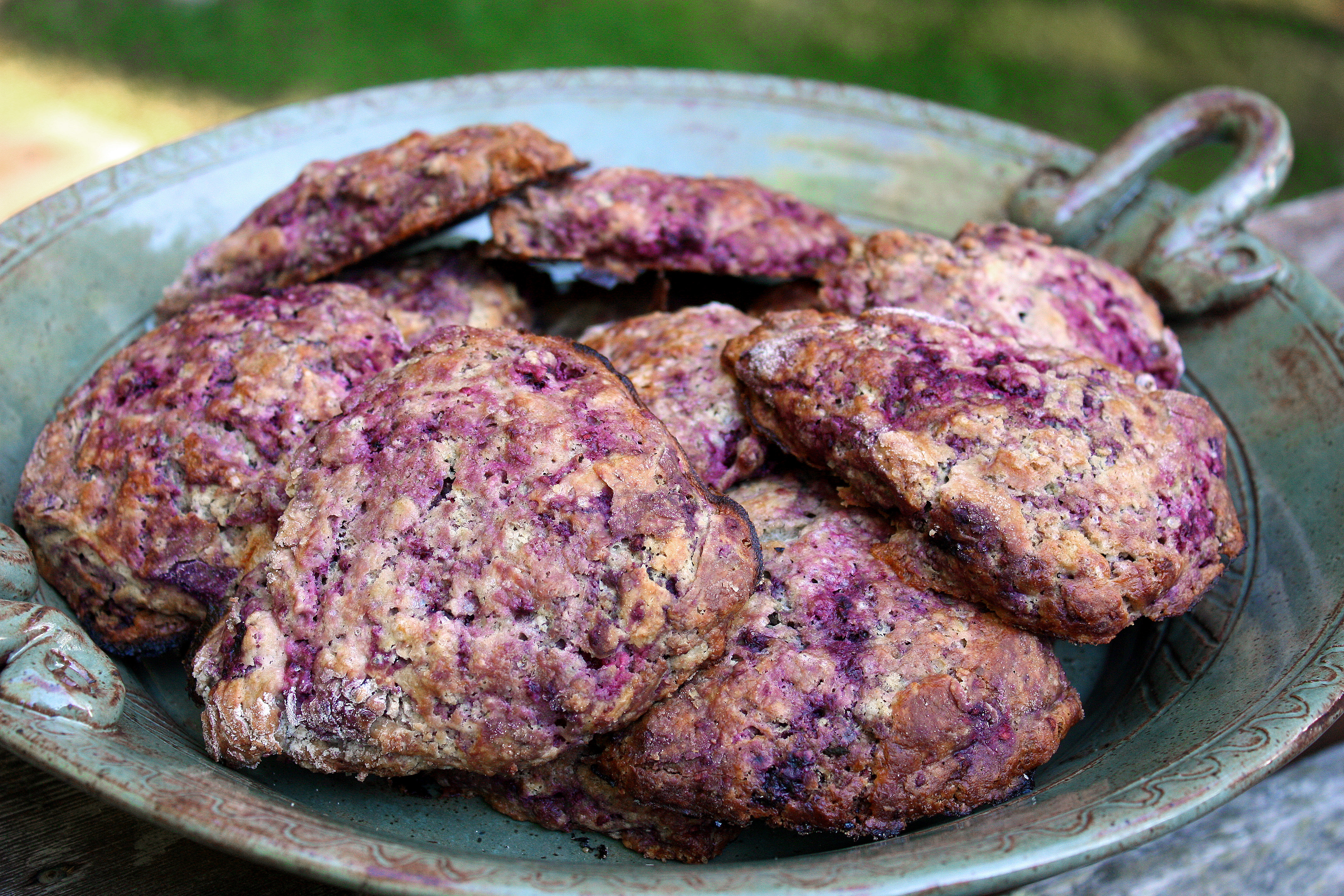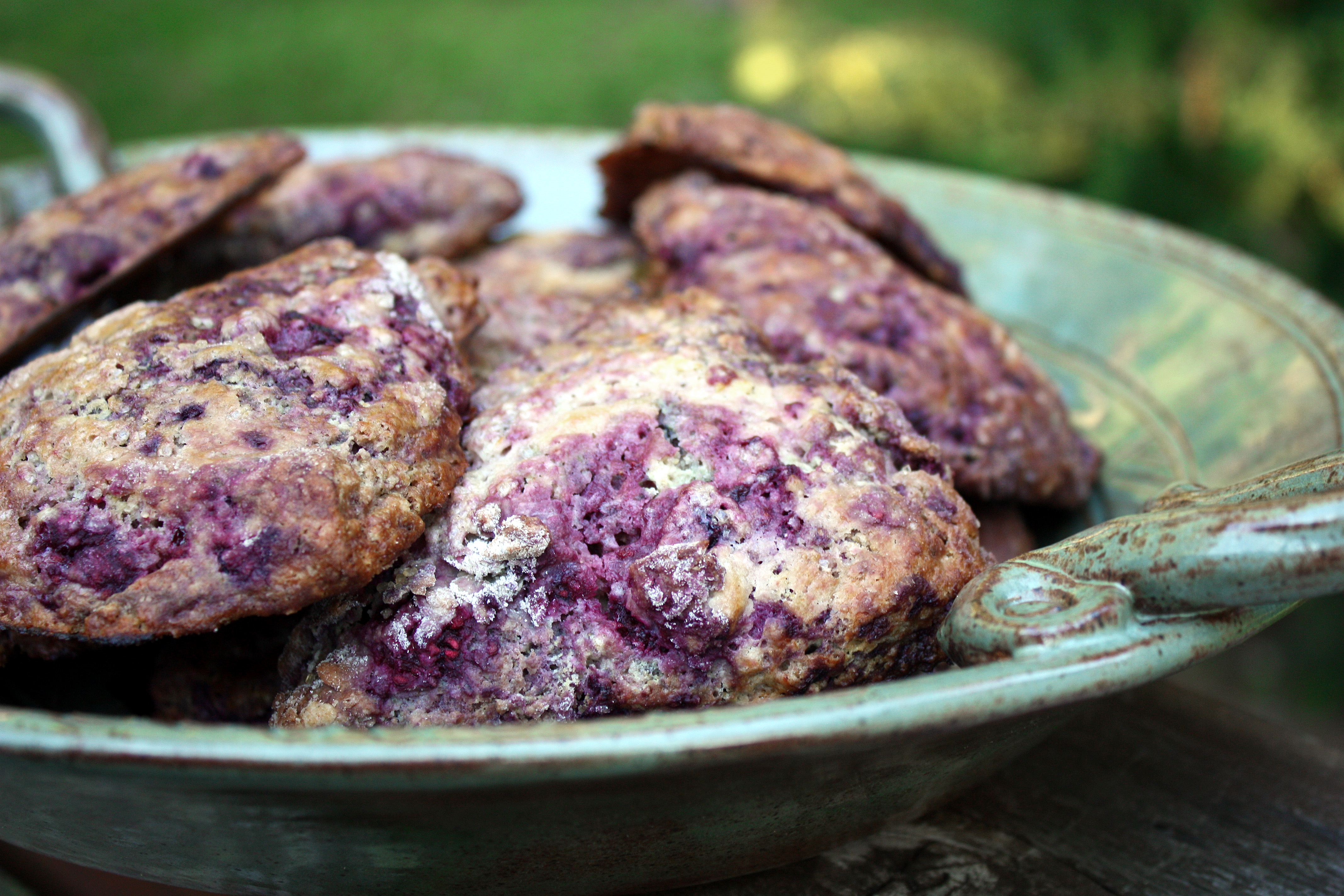 You really have to use frozen berries here; even the firmer wild raspberries will not hold up to the handling of the scone dough, and will make your dough too wet to hold a shape. As it is, this dough was quite wet and a bit difficult to work with (if this is your first attempt at baking scones, I might suggest an easier dough to work with, like cranberry orange or wild blueberry and grapefruit) and the baked scones are a little softer and less dense than my typical scone recipe. But the flavor? The flavor makes up for the extra effort, the sticky purple hands (and the likely-indelible purple stain on your favorite white linen dishtowel). I ate the first three scones within 10 minutes out of the oven; I had to restrain myself from eating a fourth. (They are hidden under a kitchen towel now, because they smell so good that if I walk by them and catch a whiff, I’m eating another before I know it). They have that brilliant depth and purity of flavor that only seems to come with wild foods; commercial berries, even raised-with-love organic berries, don’t come close.