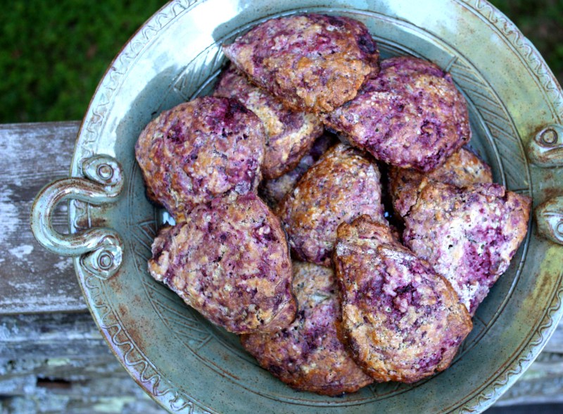 Because woman cannot live on jam alone: wild & crazy purple scones for your Sunday morning. Made with wild black raspberries from my backyard, these delicious scones get their wild purple color (and flavor!) from slightly smushed black raspberries in the dough. Much like many of the area farms, we’ve had a terrible wild berry crop this year; I only saw a few black raspberries on the bushes, the wineberries came and went in a flash, and I haven’t harvested a single blackberry from our wild front yard vines. Despite this bummer-of-a-berry summer, however, berries freeze well, especially the wild ones which tend to be smaller, sturdier and more firm than their commercial counterparts. These scones were made with wild berries from last summer’s backyard harvest.