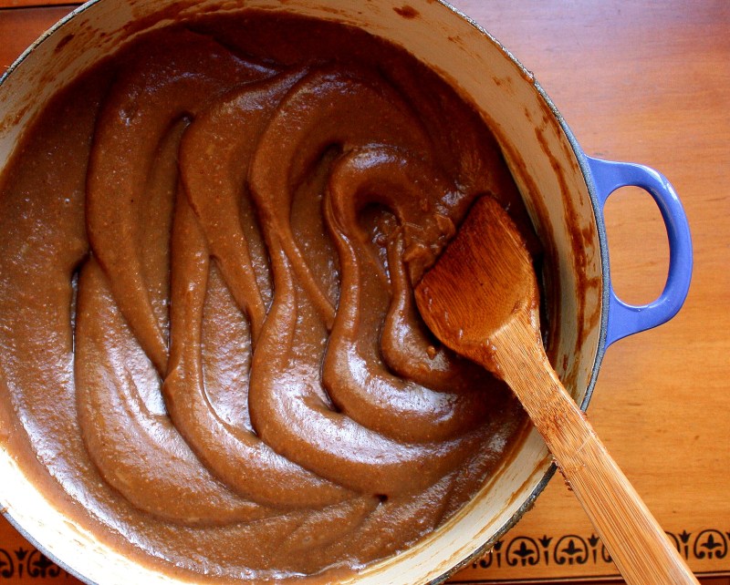 4. Transfer the pear juice to a large (6-quart), heavy-bottomed preserving pan or Dutch oven. Place the fennel seeds into a cheesecloth spice bag (or use a tea infuser) and add to the juice. Bring to a boil over medium-high heat and continue to boil, stirring occassionally, until volume is reduced by about 3/4, juices are syrupy, foaming and bubbling thickly (temperature will be about 212 – 215 degrees F at this point), about 30 minutes. Skim foam if desired (as the juice reduces, it is easy to skim foam away from the sides of the pan; not really necessary in a butter, but I usually do it.). Before the syrup reaches 220 degrees F and starts to gel, remove the fennel spice bag and add the pear pulp, sugar and honey. Mix well to combine, reduce heat to low and simmer, stirring frequently, until the butter is thick enough to mound on the back of a spoon and will make visible tracks in the pot when you stir, about 30 – 60 minutes (a splatter screen is helpful here to keep the stovetop clean; butter will spit).
