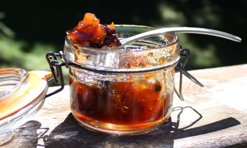 As often happens, however, when I’m not particularly stressed about the outcome (says she, as she grudgingly stomps off to the farm for another 2 lbs of nectarines), I come up with something pretty special. I was dubious about this one as it sat macerating in the fridge: the ancho chile took the beautiful contrast between white pears and yellow nectarines and turned everything a muddy brown; there was a lot more fruit than syrup; and the smell upon simmering was… not encouraging. But now that it’s all said and done, I’m kind of in love with this jam; it’s one of my favorites of this year. It’s definitely spicy and the spice hits you first: no surprise hint or lingering finish here. This is redhead spice: she’ll slap you around, tell you that you like it, and make you beg for more. But there is a complexity to this jam that belies the violent imagery: the sweetness of the fruit, sugar and honey play off the spice like a Simon & Garfunkel harmony; the spice itself is layered, with a backbone of smoky ancho supporting the dramatic riffs of the flashy guajillo. The nectarine and pear are like the loyal doo-wop girls: you might not notice them at first, but without them, the song is flat. And then, because no band jam is complete without it: tequila.