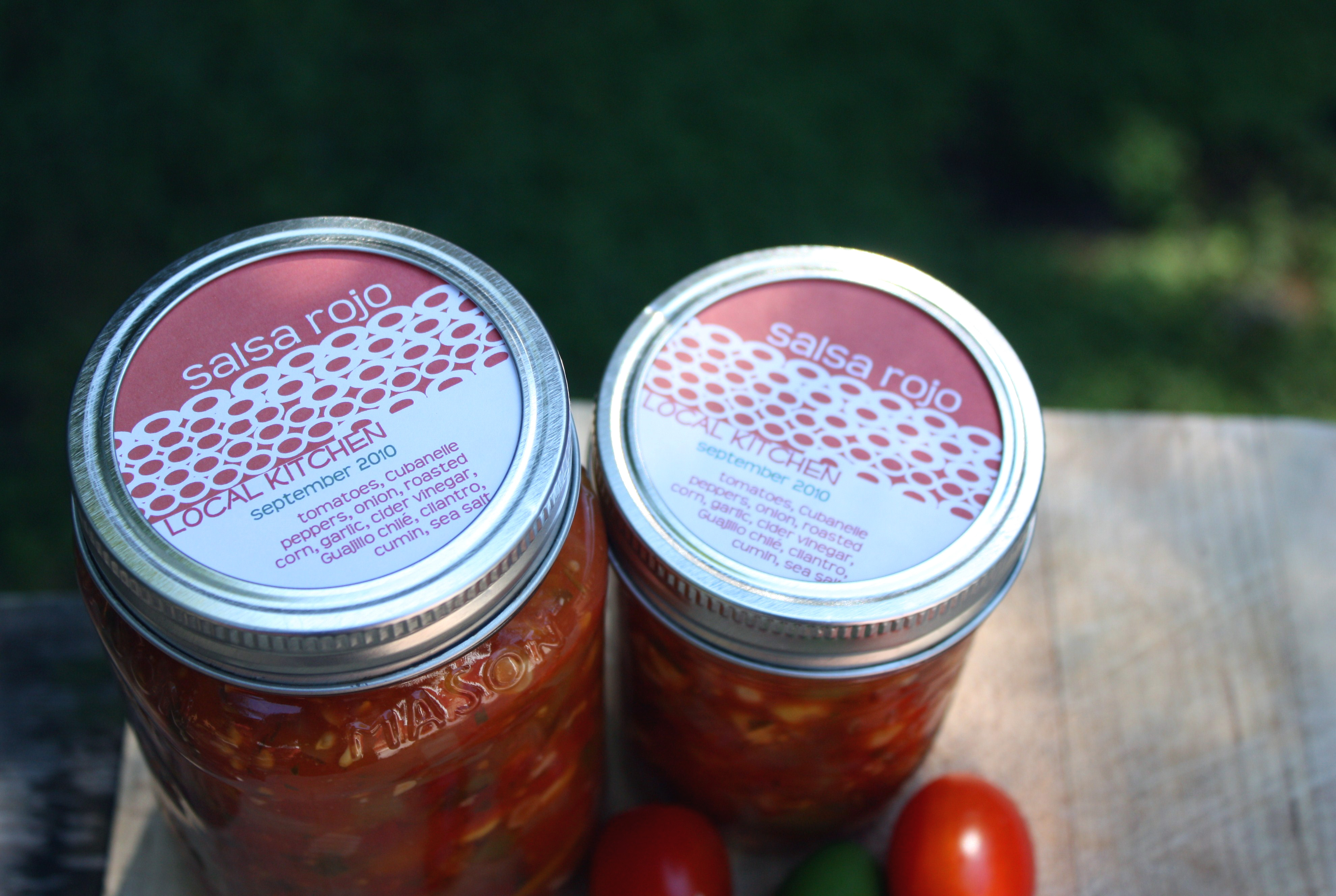 Corn in salsa? Why, yes, thank you for noticing. I’m not sure why you never seem to find corn included in salsa recipes, since corn and tomatoes are such a natural pair. Maybe it’s because salsa always seems to be served with corn: corn tortillas, chips, nachos, etc. But I got it into my head to add some of Tai’s delicious grilled corn to a basic, flavorful, spicy-but-not-killer-spicy red salsa, and like an old Devo tune, it simply wouldn’t leave. I wasn’t even positive that it was safe to water-bath process corn – it is such a starchy vegetable – but a quick look through the Ball Complete yielded a BWB corn relish recipe, convincing me that the small amount in my salsa (substituted for other low-acid ingredients) was perfectly safe.