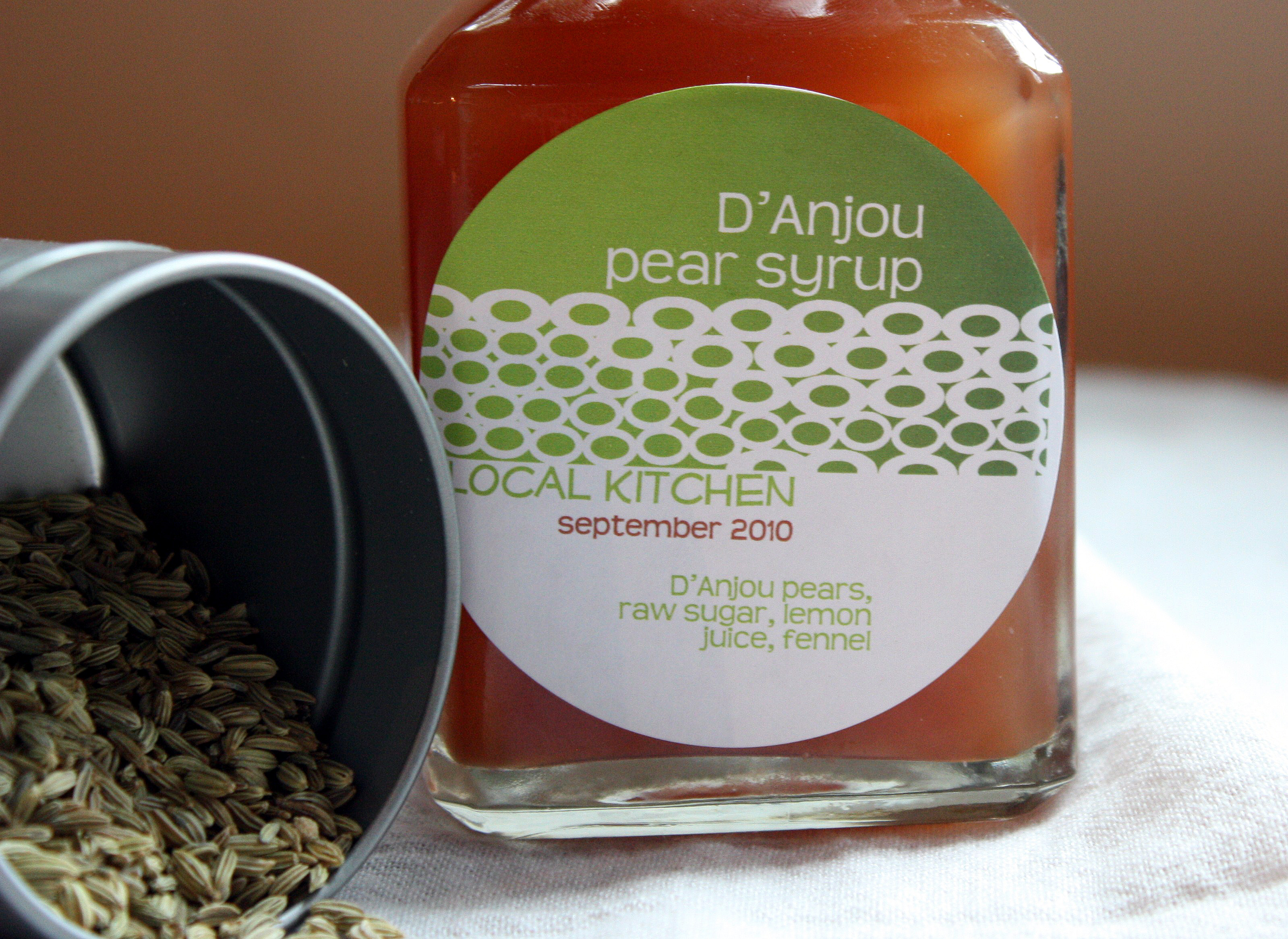 When I made the pear butter with white wine and fennel a couple of weeks ago, I was so captivated by the fragrance of the reduced pear syrup, flavored simply with fennel and a little lemon juice, that I was reluctant to add the pear pulp and continue with the butter recipe. I did, and I’m glad, as the butter turned out to be fabulous, but I decided to take the last of the teeny, tiny, Julia pear-picking excursion D’Anjou pears and make a syrup with the pear juice, then a dessert sauce with the pulp.  This recipe is as simple as can be, once you obtain the pear juice; add a little sugar, a little fennel, a touch of lemon juice and boil until it looks thick enough for you. Voila – a delicious, nutrious and inexpensive alternative to maple syrup over pancakes, a perk-me-up dollop for a touch of the exotic in your daily yogurt, a wonderful glaze for meat or fish and a way to turn a basic pound cake into something really special.  The combination of pear & fennel is magical and this is one of those recipes that tastes like more than the sum of its parts; complex and gourmet while being a downhome, backyard fruit preserve. Excuse me while I go make some pancakes.