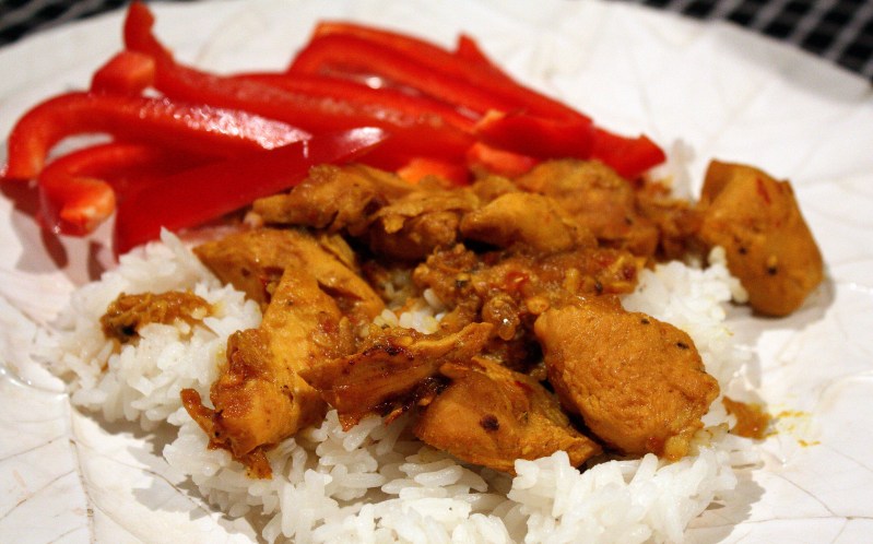 - Serve over rice (or other grain), garnished with red bell pepper or other bright, crunchy vegetable.