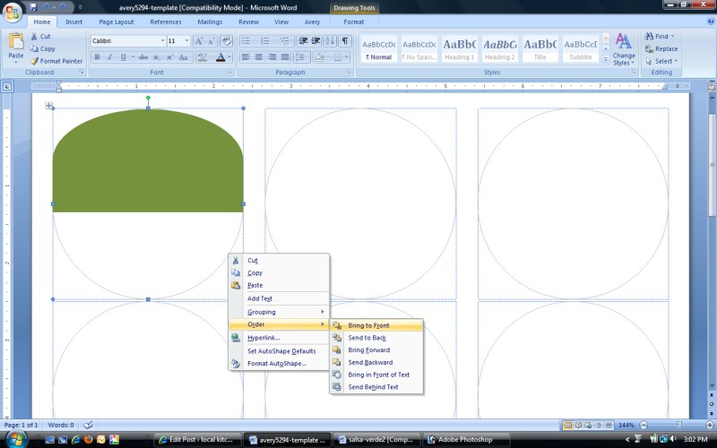 6. So now you have a filled-in, color, top half of a label. But you’ve obscured the label outline with those ‘shoulders’; to fix this, select the template shape (as opposed to the shape you added; the entire square [the table cell] will show blue boxes and dotted blue outline. Move the cursor over the circular outline until you see the + with arrows, then click to select.). Right-click, scroll down to Order on the drop-down menu and select Bring to Front. You should now see the circular label outline again.