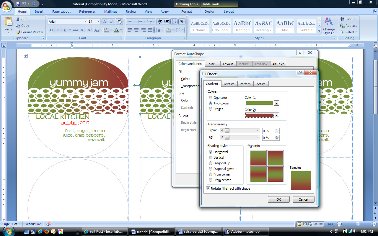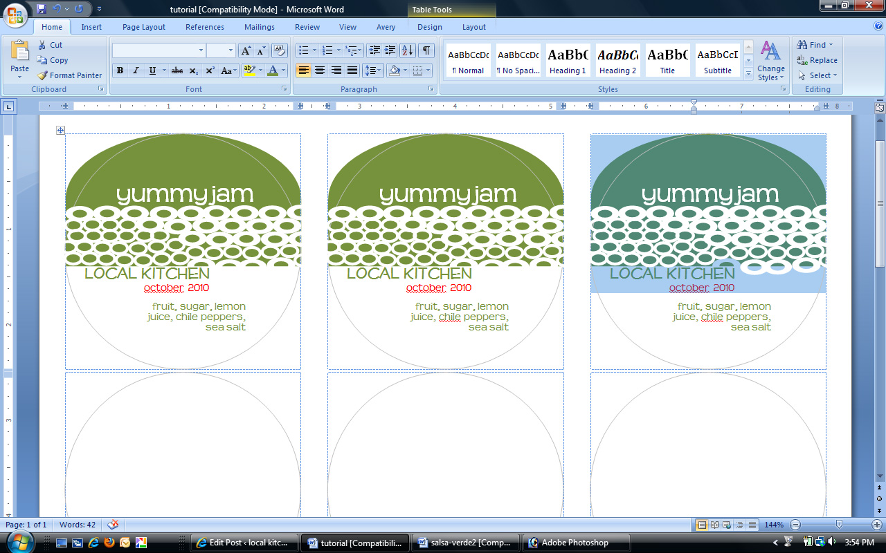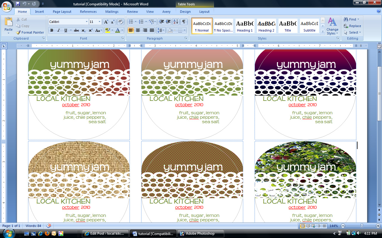 1. Nice work! Your labels have great design. As a diehard user of Photoshop, Illustrator, and InDesign I had no idea Word was capable of such creative tasking! I have been creating labels for my preserved products for several years with photos to showcase the contents of the jar. A label on the lid is easy reference and a label on the jar obscures the beautiful contents in the jar.