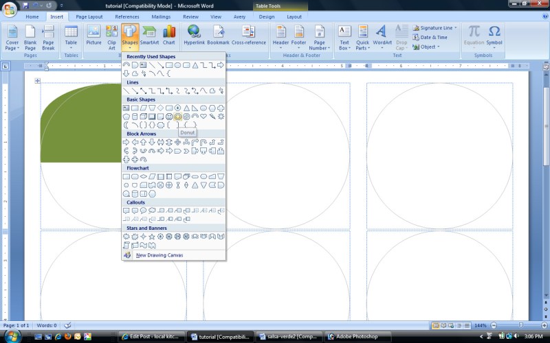 7. To insert the design strip of circular shapes, I went back to the Insert, Shapes tool (this was laborious and time-consuming, and really, I don’t recommend it. I love these labels, but I’m sure there is an easier way! If I had thought about it more at the time, I would have gone with a long, wavy stripe, or one of the patterns available under Format, Autoshape [see step 14]. I encourage you to come up with your own designs, hopefully easier than mine!).  Go to Insert, Shapes and under Basic Shapes select Donut. You’ll get the + sign cursor; hold down the mouse and insert a donut, the shape & size you want it (I pulled these wide to make oval shapes; you can, of course, use any shape from the menu that you like). The donut will be white with a black outline by default; Right-click on the shape, and click Format AutoShape. Under Colors and Lines tab, choose Line, then No Color.