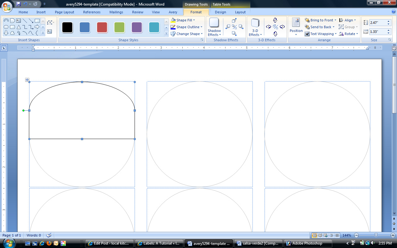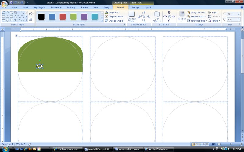 5. Now you have a semi-circle (with shoulders) aligned with the tops and sides of your circular label template, that covers about half of your circular label template. Click on the shape so that it is selected (blue boxes and dotted blue outline will be visible):Either right-click to bring up the Format AutoShape menu, or go to Drawing Tools, Format, Shape Styles box, and select Shape Fill to pick a color for the top half of your label. Just under Shape Fill you’ll see Shape Outline. Go to this and select No Outline.