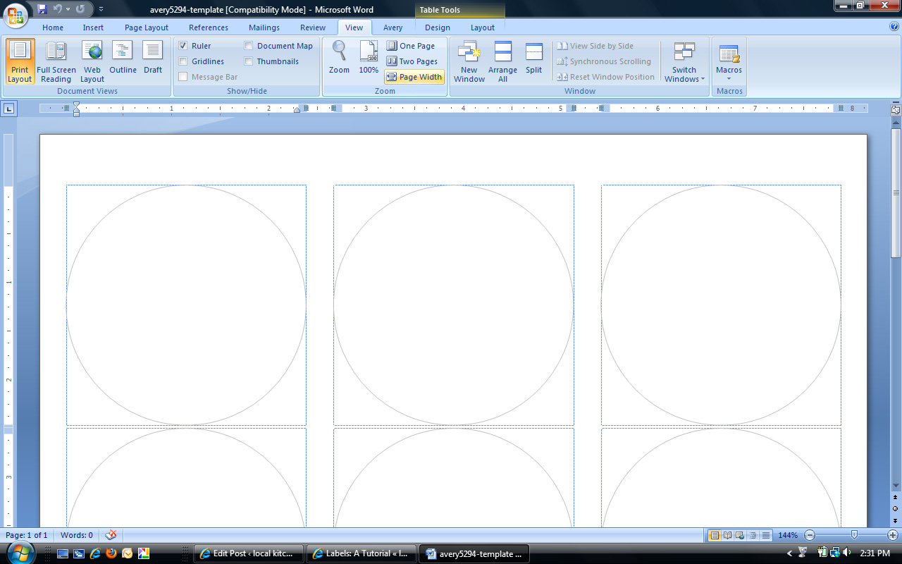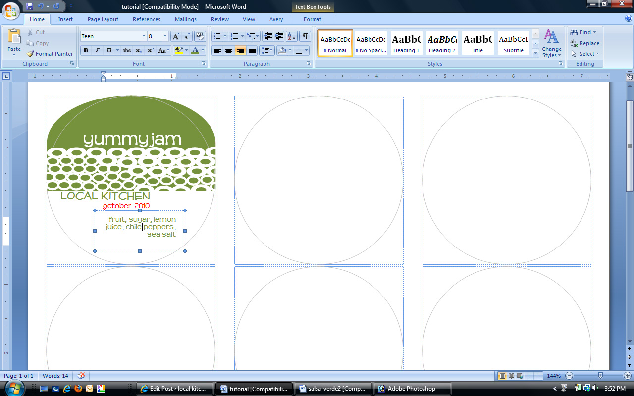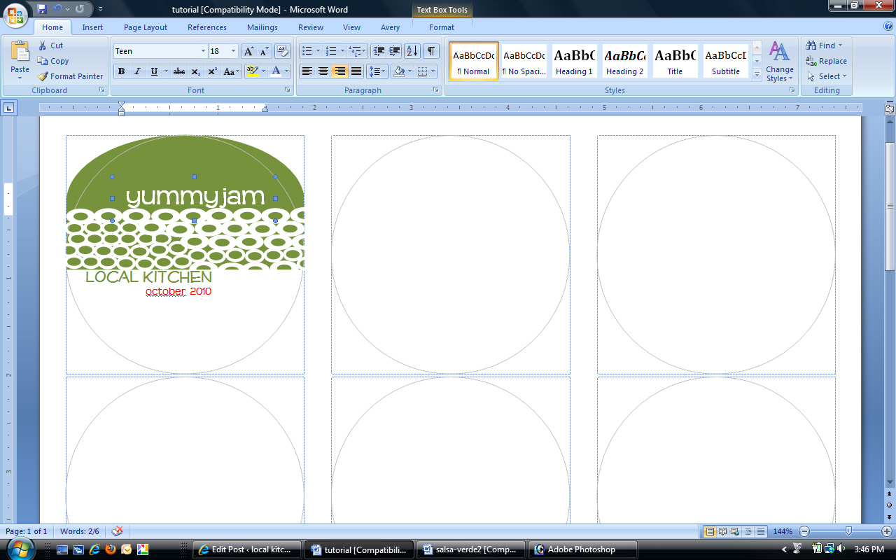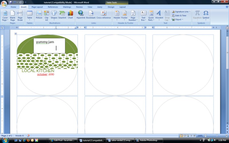 1. Download the template. Save it as something you’ll remember (label-template.doc, perhaps) so you have a blank slate to go back to if need be. Under the View tab, select Page Width to make viewing easier. The circular labels (and template) fit a standard-mouth Ball jar lid perfectly, but, when a jar is assembled with a ring or screw-band, some of the label will be underneath the band; bear this margin in mind when designing your labels and leave yourself a little room at the edges.