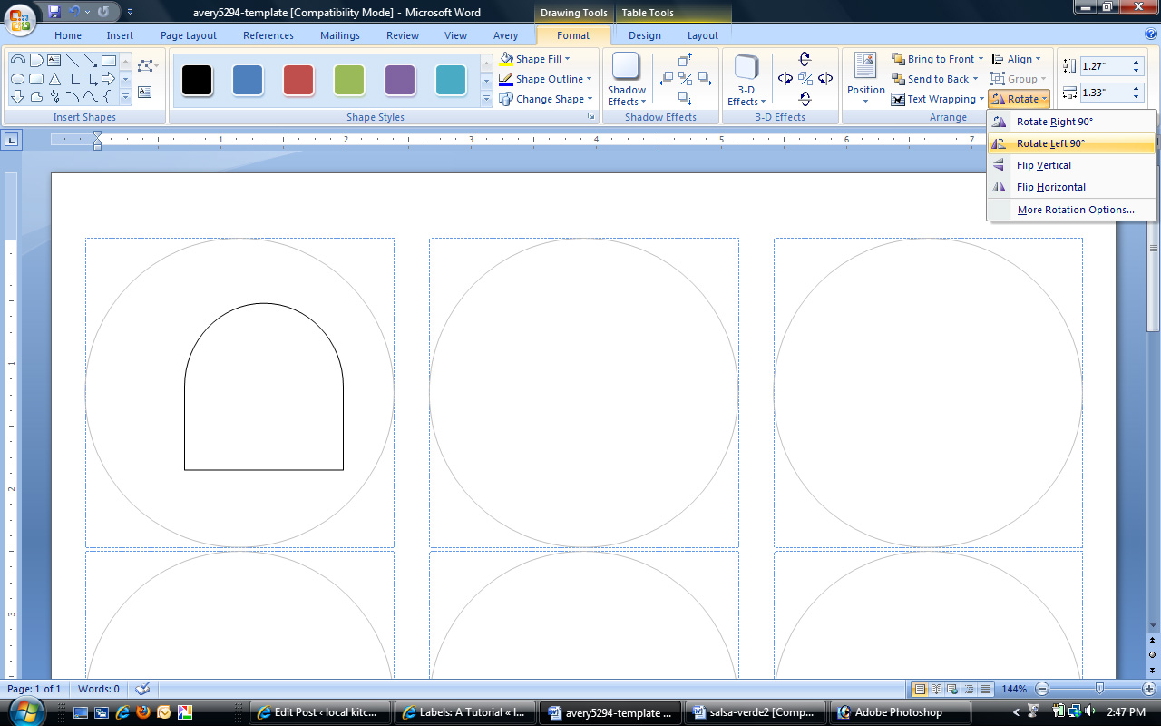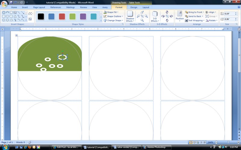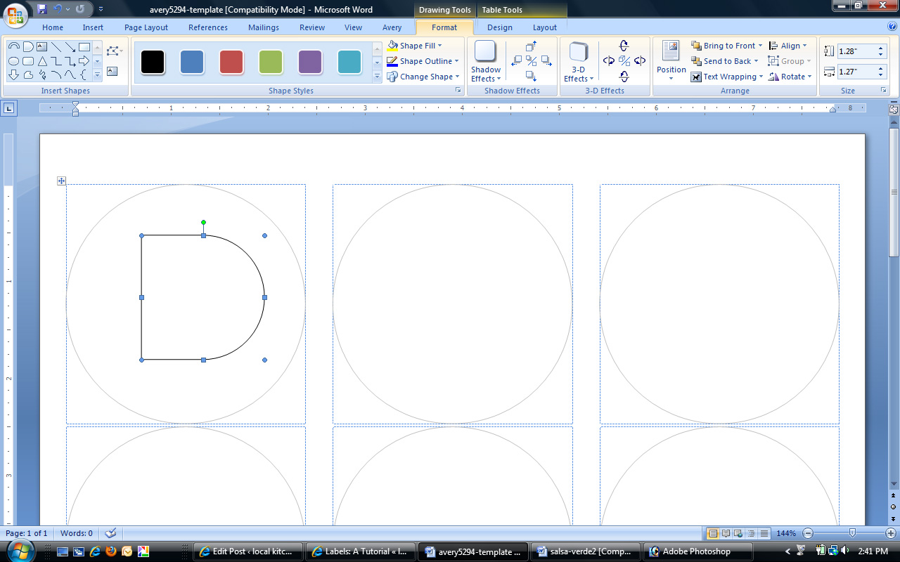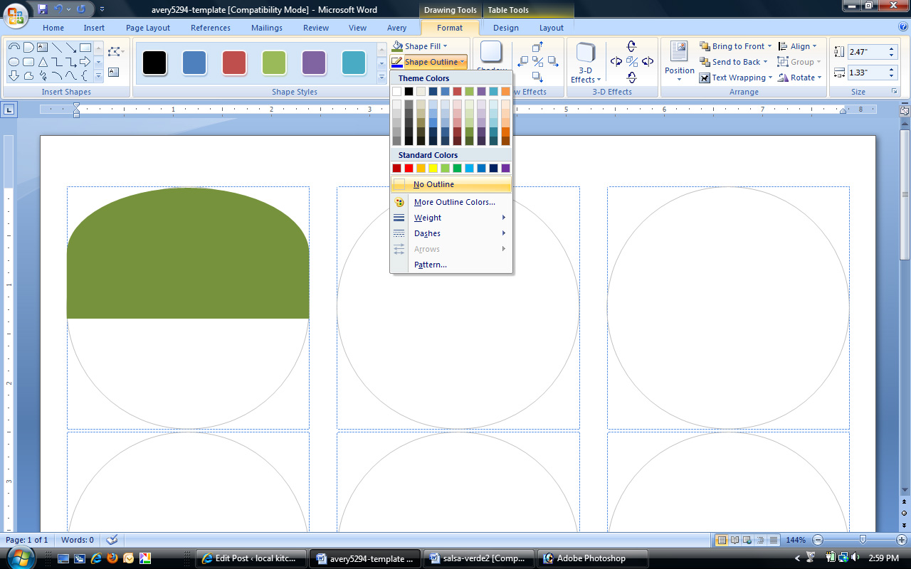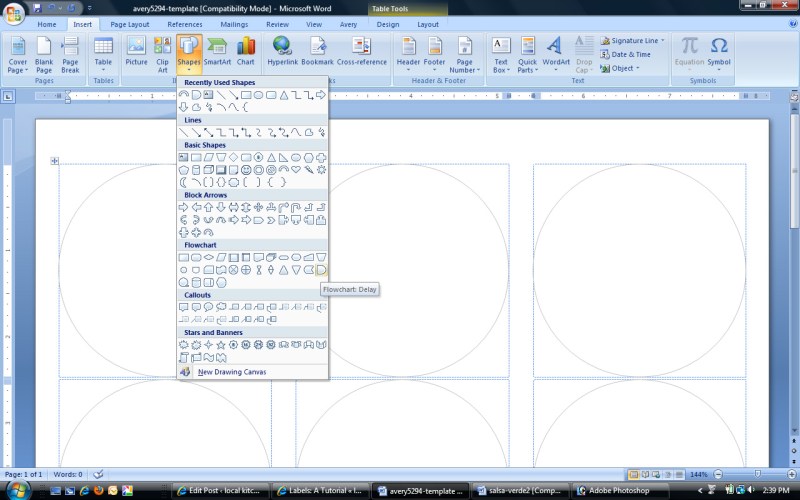1. Download the template. Save it as something you’ll remember (label-template.doc, perhaps) so you have a blank slate to go back to if need be. Under the View tab, select Page Width to make viewing easier. The circular labels (and template) fit a standard-mouth Ball jar lid perfectly, but, when a jar is assembled with a ring or screw-band, some of the label will be underneath the band; bear this margin in mind when designing your labels and leave yourself a little room at the edges.