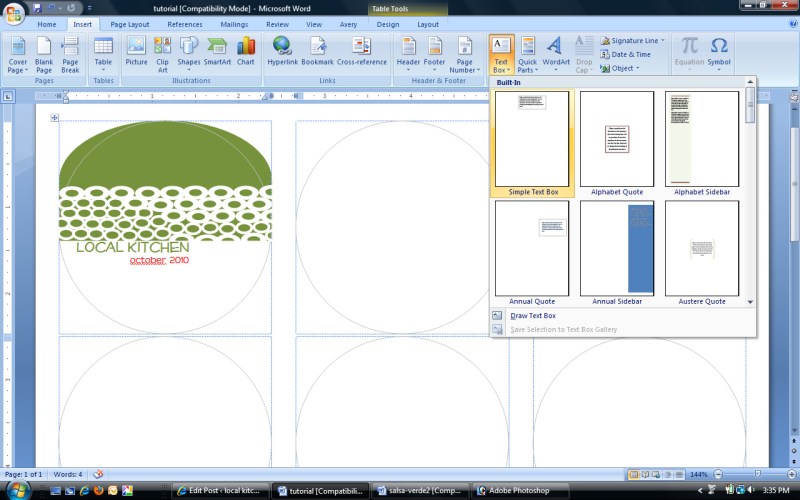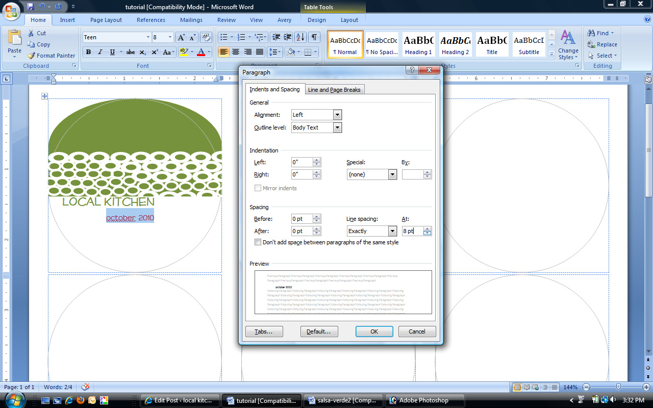 9. Now that you’ve filled in your design strip, it is time to add text to your labels. I add most of mine with text boxes, for greater control in where I can place the text on the label; however the “Local Kitchen” text is directly typed into the cell: just click the cursor anywhere in the circle. Left align the text in the cell (use the Left Align icon, Home tab, Paragraph box), then hit return until the cursos pops below the autoshape.  Type a few blank spaces (to give yourself a margin) then your text. The LOCAL KITCHEN font is Mufferaw 15 pt, and the date (“october 2010”) is Teen 8 pt. To adjust the spacing between lines of text (i.e. move the “october” text higher, closer to the “Local Kitchen” text), select the october 2010 text and go to Paragraph under the Home tab.  Click the bottom right-hand arrow to expand the Paragraph box. Under Spacing, Line Spacing, choose Exactly and 8 pt (or the exact size of your text) and make sure the “before” and “after” spacing on both lines of text is set to 0 pt.
