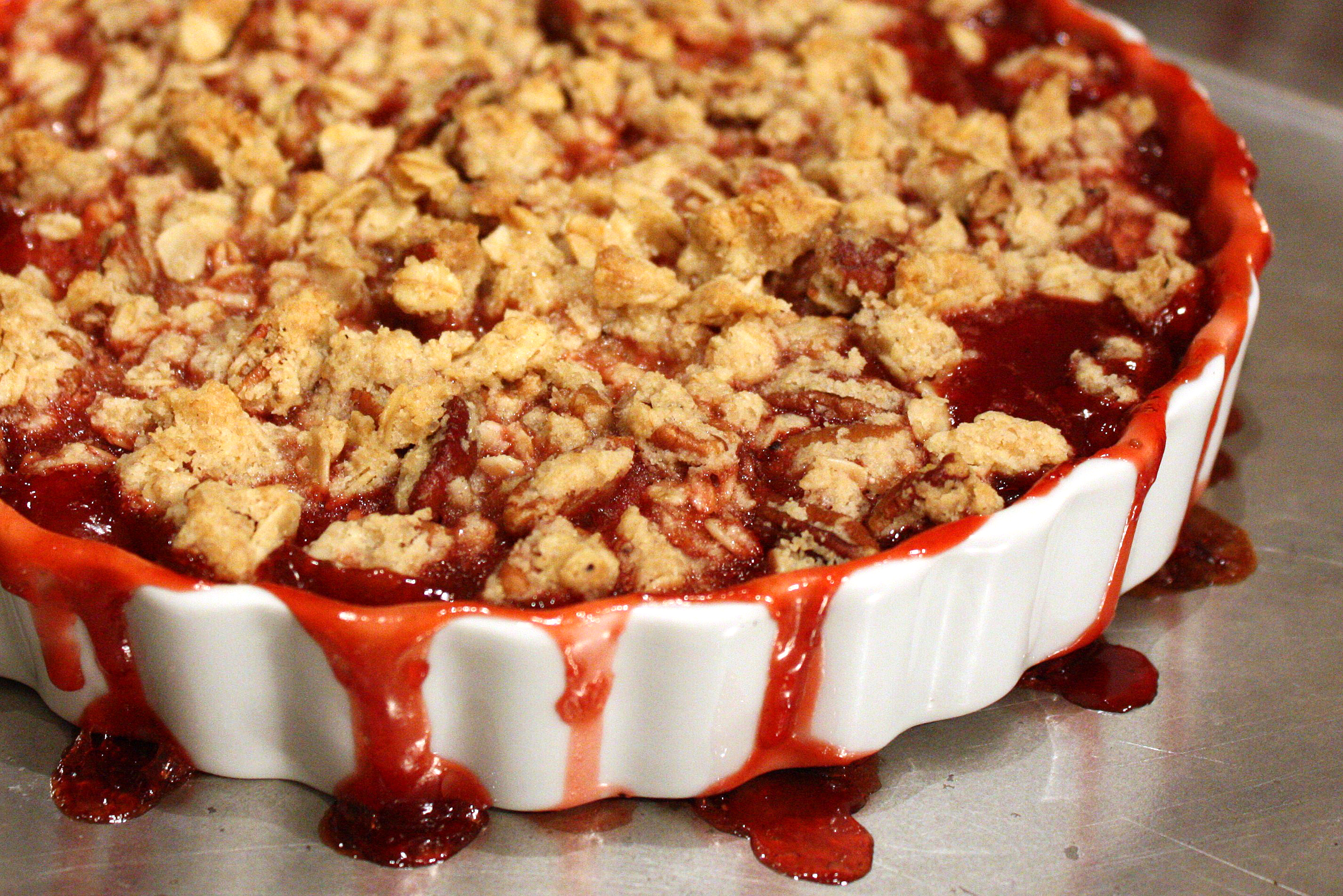 There’s nothing bad about this recipe: it comes together in minutes, it is endlessly adaptable (this latest version I scaled down to use 8 oz of strawberries and 6 oz of rhubarb; swapped amaretto for port and pecans for pine nuts), the basic ingredients are usually on hand, and it works just as well with frozen fruit as fresh.  When Tai calls and tells me he’s bringing home a friend from the cliffs for dinner, I can whip this together in 10 minutes and have it out of the oven before he walks through the door, saying “Oh my GOD, what is that smell??” And, despite my lack of enthusiasm for cooked-fruit desserts, even I eat this one now & then: it is that good. Trust me, this is a basic that you’ll be happy to have in your repertoire: no matter what the season.