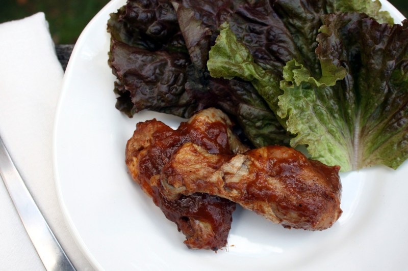 This was my lunch on Tuesday, such a glorious, warm, sunny day that I was compelled, despite a crazy-busy week and a looming analysis deadline, to enjoy it out on the back deck. Because basking in the sun, watching the leaves drift down, and reveling in sticky, messy, moist & delicious, finger-looking good barbecue chicken is soon going away, not to be seen again around these parts for many moons.