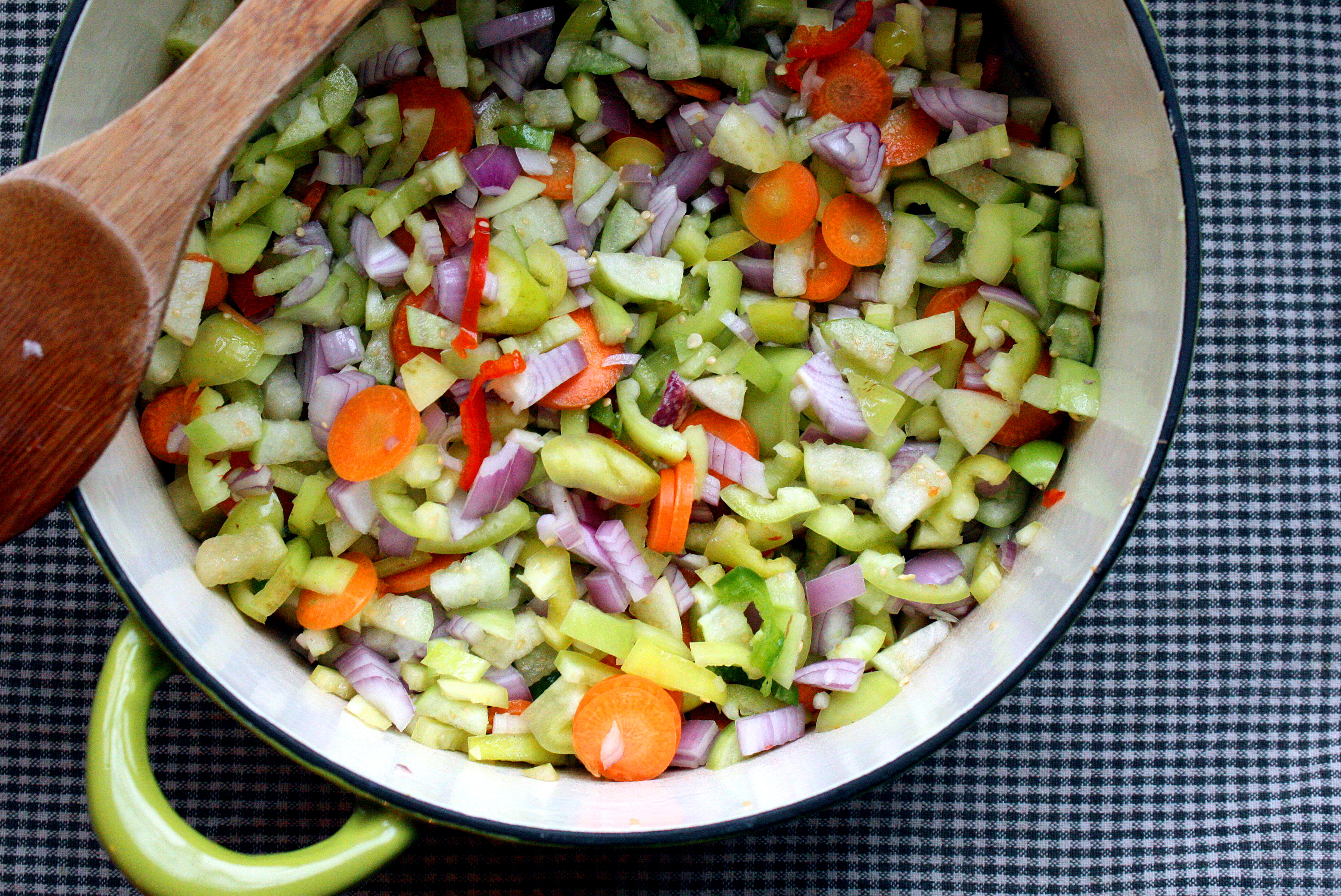 This soup started off in my head as this black bean version from Smitten Kitchen, but seeing as I was missing most of the main ingredients (Well, that’s not exactly true; I do have green & red bell peppers in the chest freezer. In the garage. Outside. Did I mention the snow/sleet/freezing rain?) it quickly morphed into something else entirely. Tomatillos that have been lingering since the last day of the CSA weeks ago <sniff>, banana peppers from Holbrook Farm that were supposed to be pickled weeks ago (oops), onion, shallot and carrots combined in a big pile of aromatics that smelled irresistable sautéing in bacon fat. Add garlic, lots of cumin (there’s the nod to the Smitten recipe), water & black beans and you have the basis for a fabulous lunch. Add some jalapeno cornbread and you might, just might, start believing that Fall is not over after all.