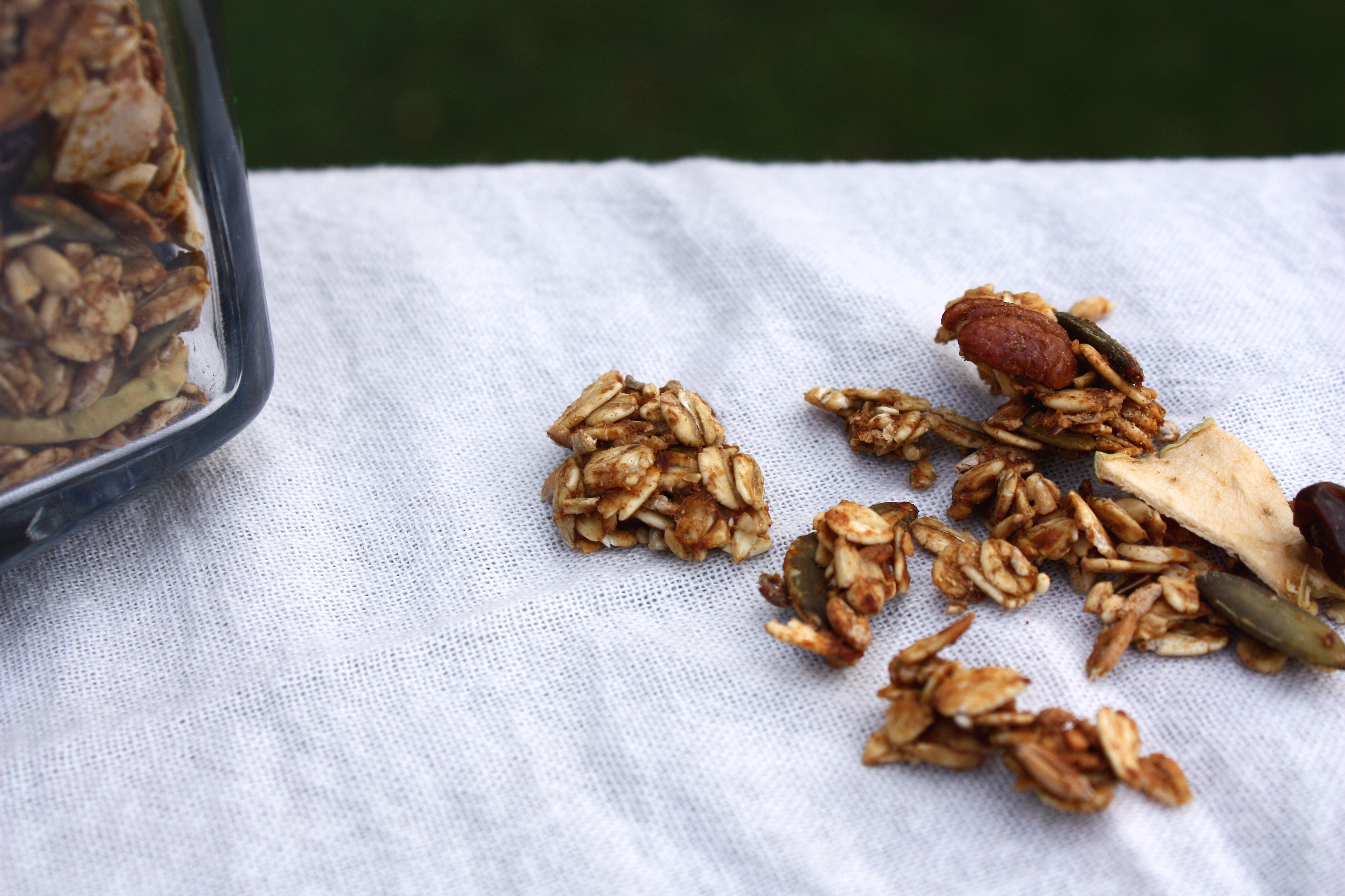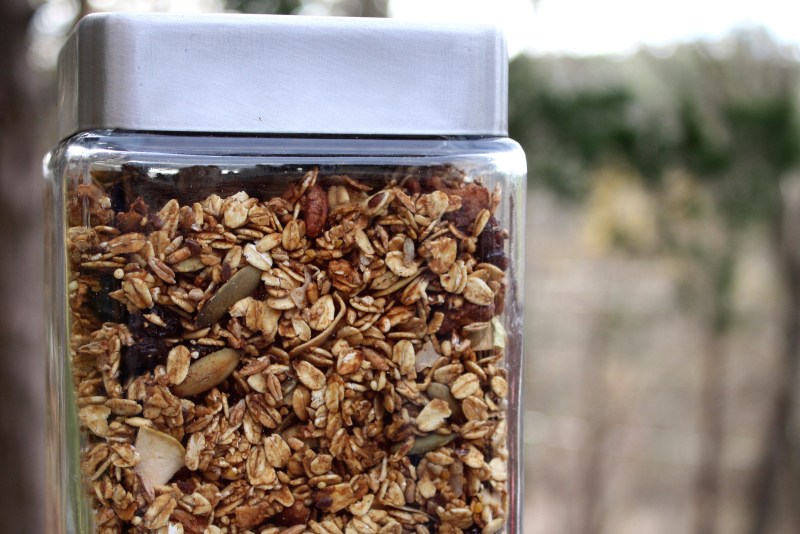 In addition to the fruit butter, if you have preserved fruit in syrup and have leftover syrup to use, you can replace the 1/4 cup of maple syrup called for in the recipe with any fruit syrup: simply tailor the flavor of your granola batch to the flavor of your butter and/or syrup. If you use a light syrup, you may need to cook the granola a bit longer (or bake on convection, if you have it, to help crisp the granola) at a lower temperature in order to cook off the extra moisture. Or, if you have a loose-set jam or a Ferber-style preserve, you can use that as well, in place of the pumpkin or fruit butter: just hit it with the immersion blender or food processor first, to make smooth, then proceed with the recipe.