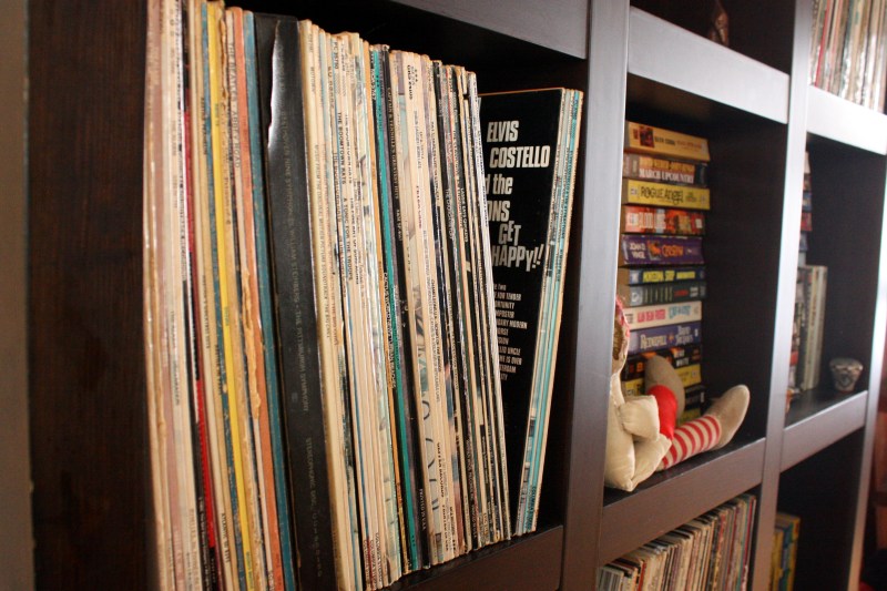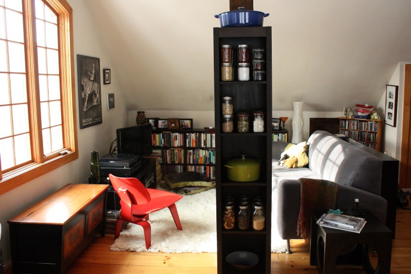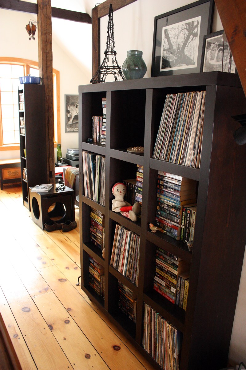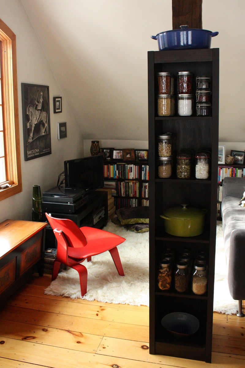 Without my realizing it, one of the pieces that had been bugging me for a while was an old (as in 1990 old), rather battered tower shelf that held my albums (yes, as in vinyl; I’m so retro I’m hip again). It was sort of a crappy set of shelves when I bought it, as a poor, just-out-of-college kid, scraping by in Boston on a temp secretary’s salary. But, because I never throw anything out, I still had it: I’d given it a facelift a few times over the years, painting the shelves various colors (silver being the latest incarnation) and mostly it was sort of invisible: the albums drew the eye, not the shelf itself. I realized in a flash that: 1) I was sick of looking at it; 2) if I got it out of the way, I could put something else there that could be functional for kitchen storage; 3) if I moved it to the garage, I could use it for extra jar storage(!). Of course, it wasn’t quite that simple. We toyed with several different options: move the albums to the bedroom (already a tight squeeze, and didn’t make sense as it is not near the turntable), split the album tower into two shorter shelves (they are stackable, modular sections) and use them as two endtables (a cool idea, but we only had space for one endtable and  it didn’t solve the “sick of looking at it” problem); move the albums to the loft (again, access and convenience to the turntable an issue, besides, I like to have them out where I can see them).